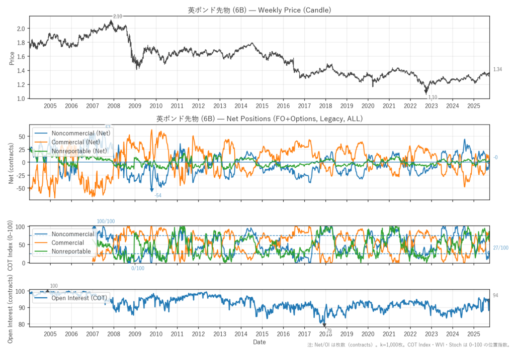 更新: 2025年10月11日 に最新データで更新しました。(COT週次データ: 2025-09-26 時点) 英ポンド先物のCOTレポートです。 この銘柄について 英ポンド/米ドルの先物。FX/CFD例: GBPUSD。注意: 英経済指標や要人発言でボラが出やすい。 COTレポート(ネッ...