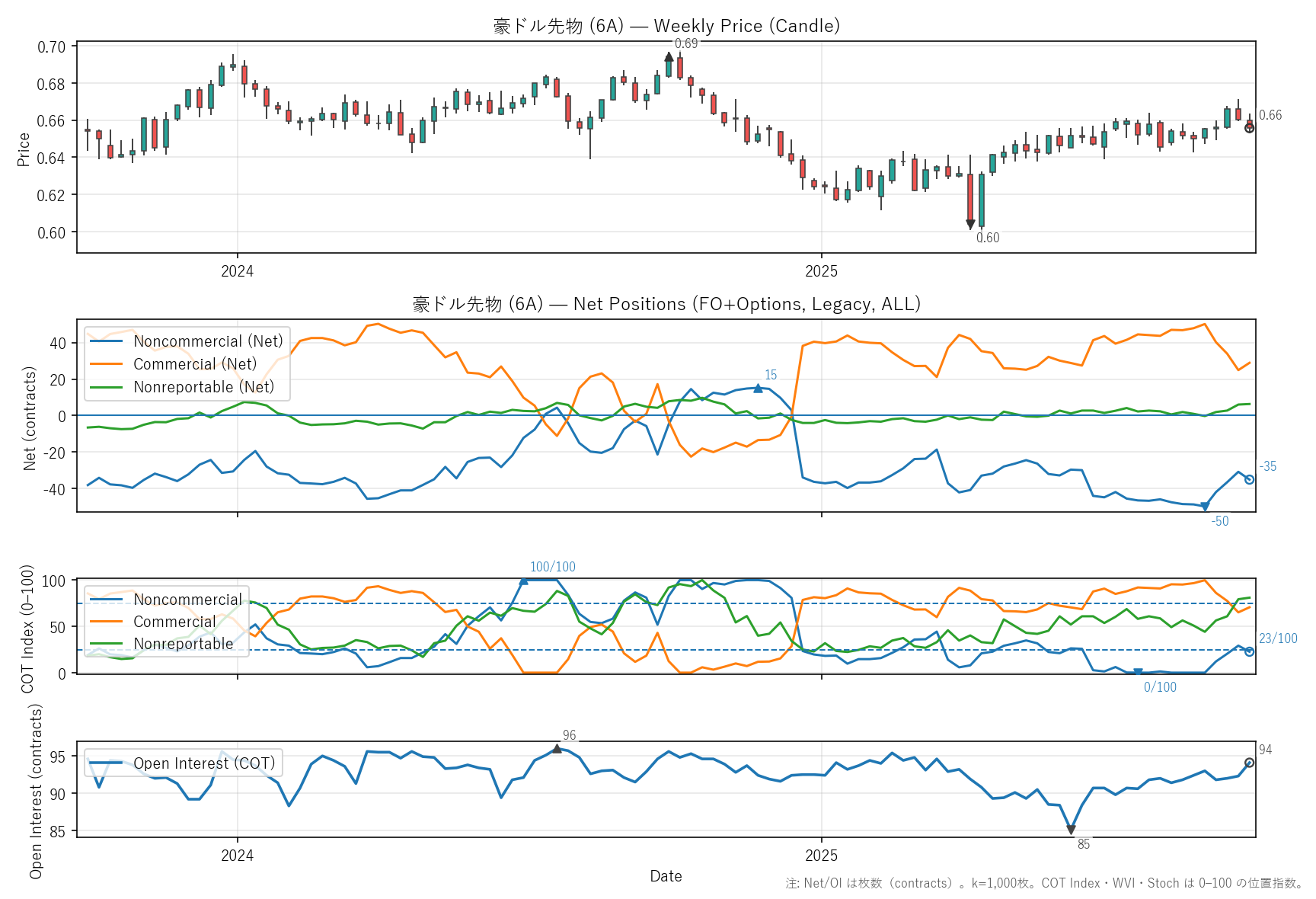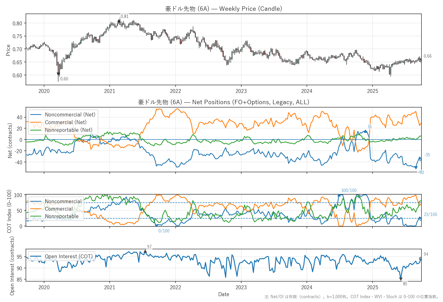 先週比(2025-09-26):非商業COT指数:-4pt(-31 → -35) / 商業COT指数:+4pt(25 → 29) / NR COT指数:+0pt(6 → 6) / Open Interest:+1.95%(92 → 94)