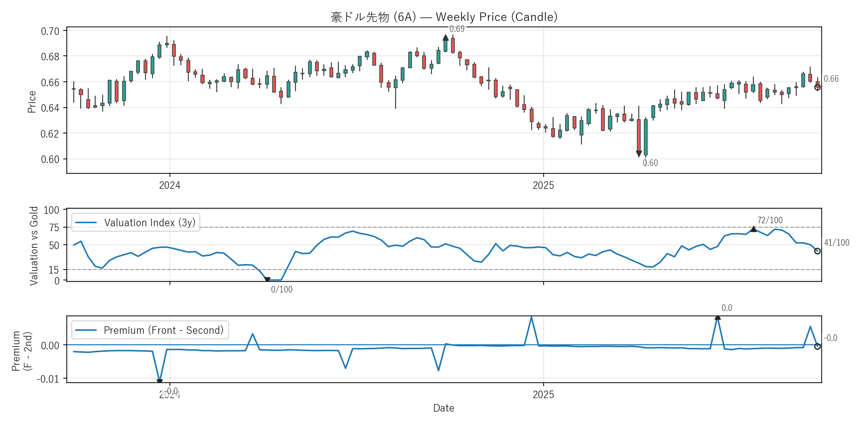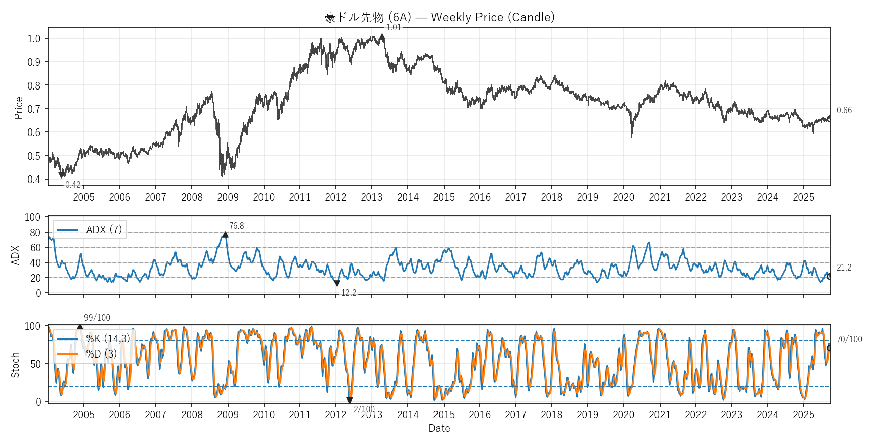 豪ドル/米ドルの先物。FX/CFD例: AUDUSD。資源・中国関連ニュースに反応しやすい。