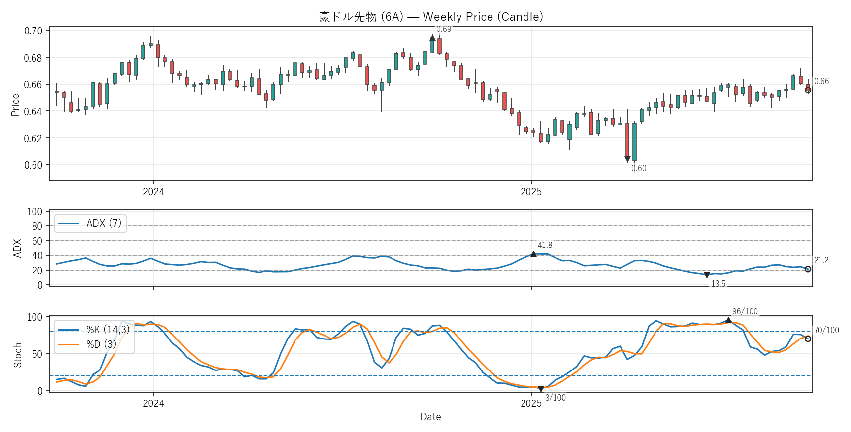 テクニカルは勢い(ADX)と位置(Stoch %K)。ADXは20超=発生、40超=強め。Stochは0〜100で80以上/20以下が目安。