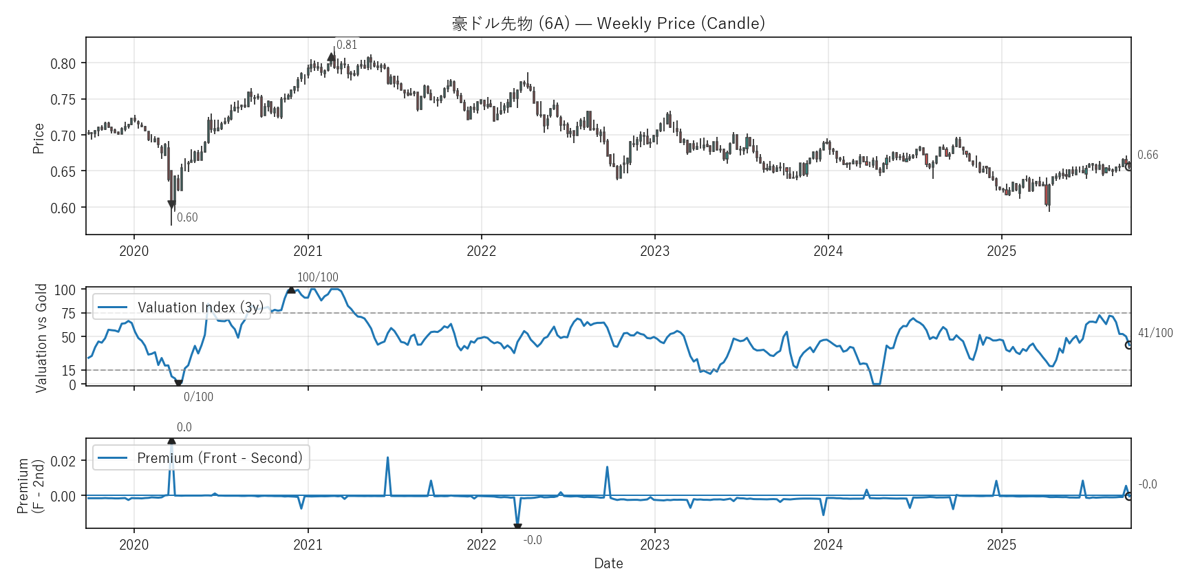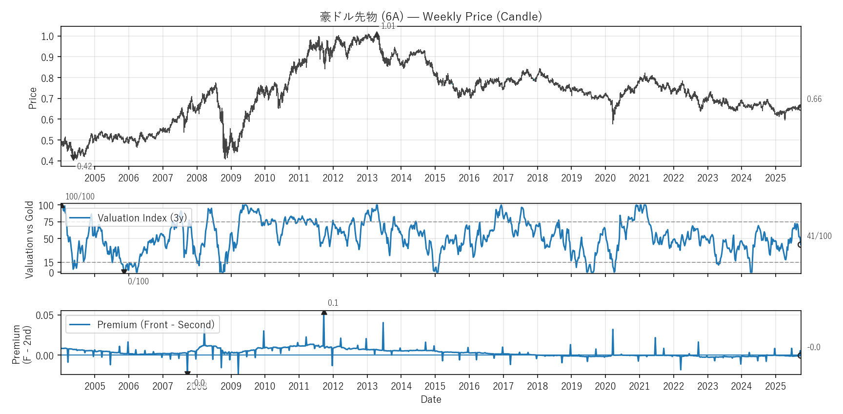 Valuation(WVI)は「基準資産と比べて相対的に高い/安いか」をみる指標。通常は金(GC)、金自身は米30年債(ZB)と比較。価格比(対象/参照×100)を短期/長期EMAで平滑化→差(PAL)の過去位置を0〜100で表示。PremiumはFront−Second(順鞘/逆鞘)。