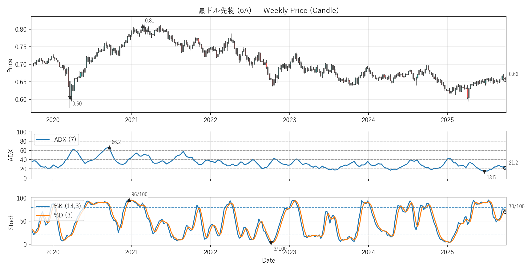 先週比(2025-09-26):週次リターン:+0.49%(終値 0.65 → 0.65) / ADX:-2.2pt(22 → 20)