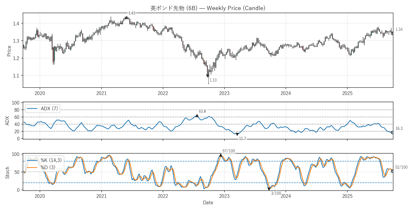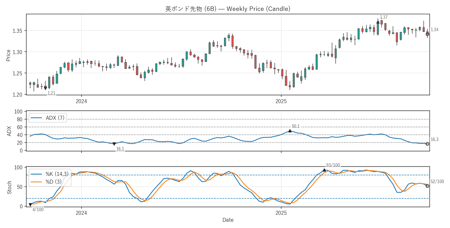 先週比(2025-09-26):週次リターン:-1.00%(終値 1.35 → 1.33) / ADX:+2.2pt(15 → 17)