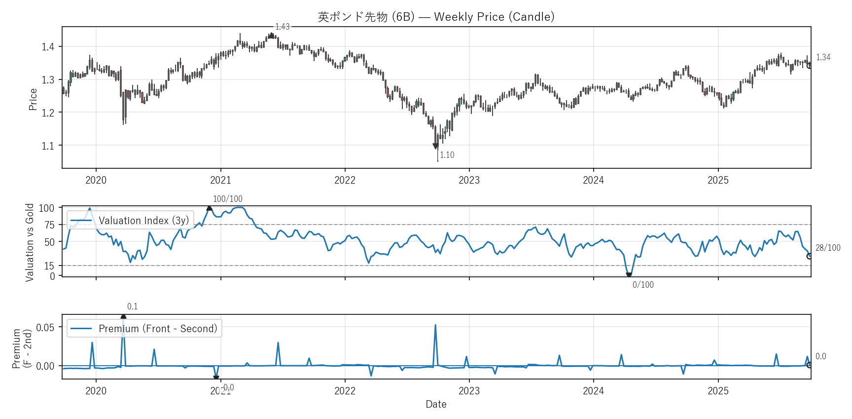 Valuation(WVI)は「基準資産と比べて相対的に高い/安いか」をみる指標。通常は金(GC)、金自身は米30年債(ZB)と比較。価格比(対象/参照×100)を短期/長期EMAで平滑化→差(PAL)の過去位置を0〜100で表示。PremiumはFront−Second(順鞘/逆鞘)。