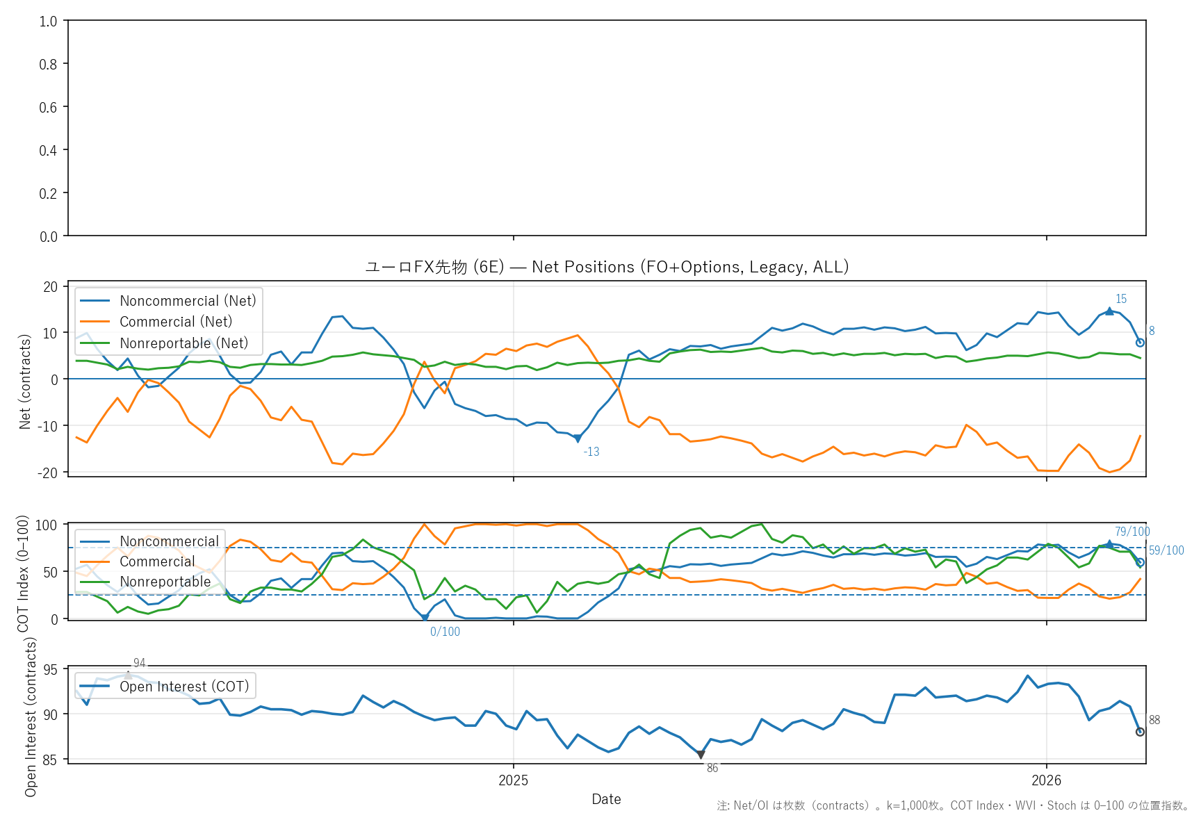 非商業COT指数:59(0〜79)|位置 75/100 / 商業COT指数:42(21〜100)|位置 26/100 / NR COT指数:54(5〜100)|位置 52/100