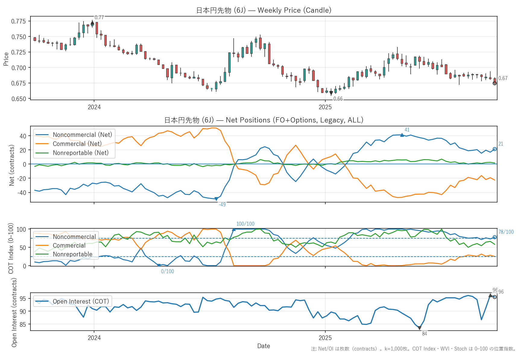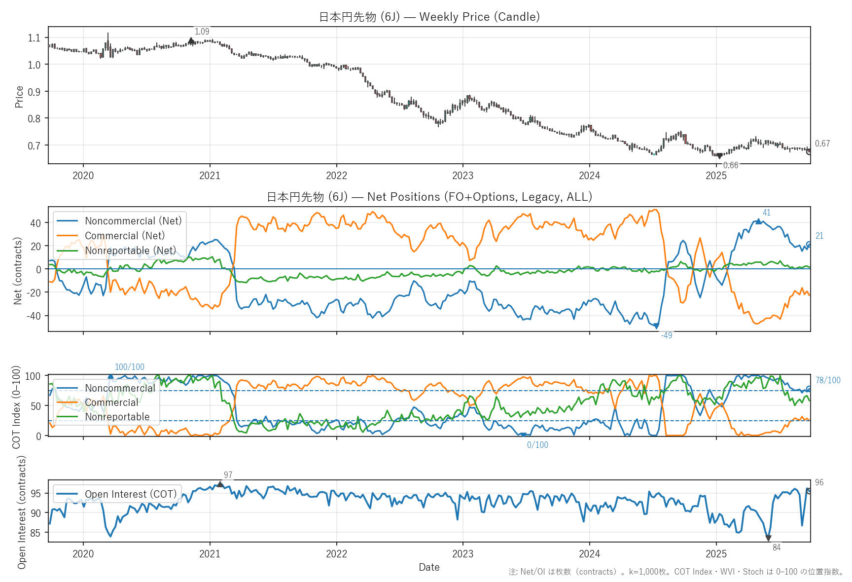 先週比(2025-09-26):非商業COT指数:+4pt(17 → 21) / 商業COT指数:-3pt(-19 → -23) / NR COT指数:-1pt(2 → 2) / Open Interest:-0.73%(96 → 96)