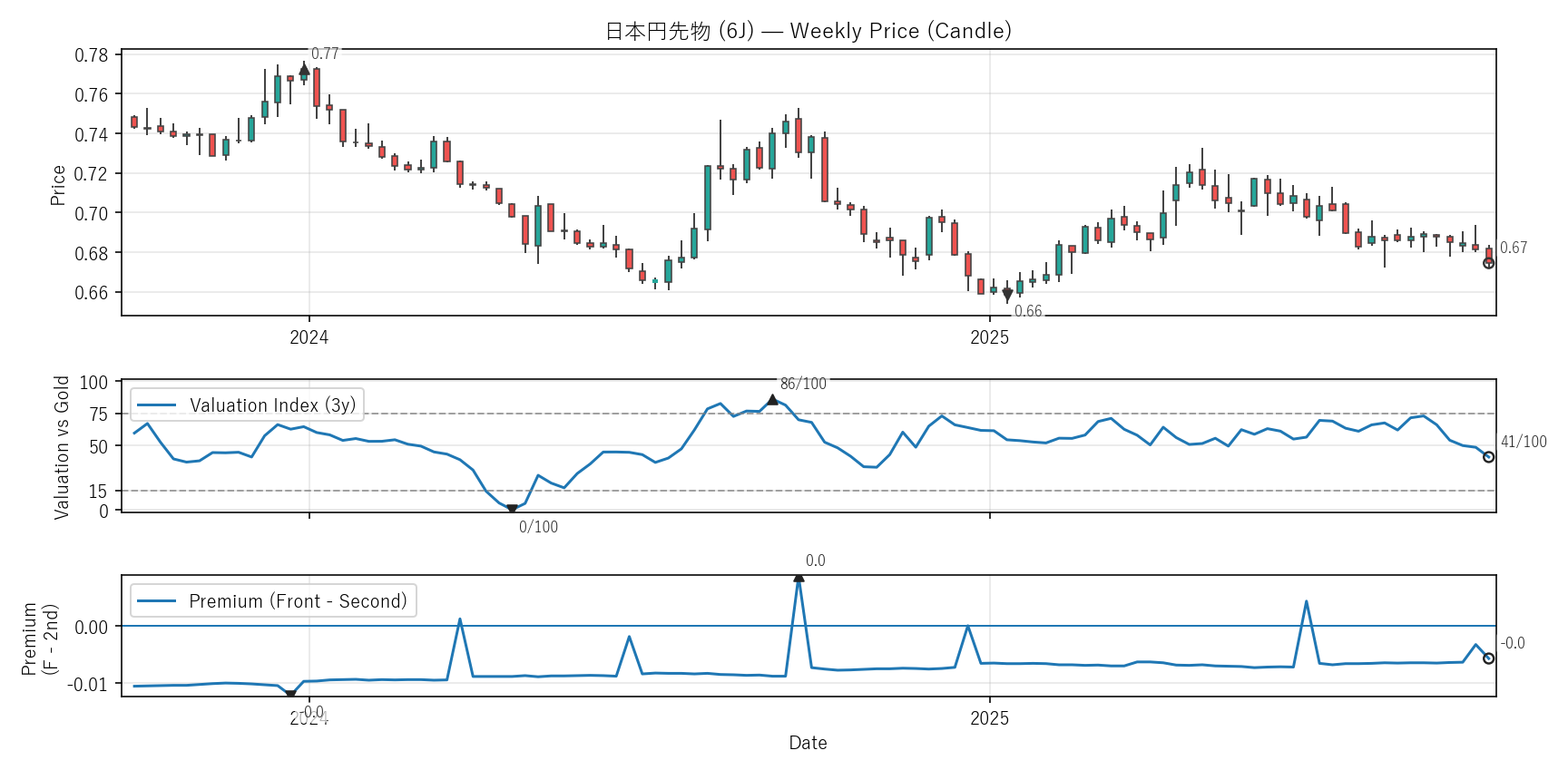 Valuation(WVI)は「基準資産と比べて相対的に高い/安いか」をみる指標。通常は金(GC)、金自身は米30年債(ZB)と比較。価格比(対象/参照×100)を短期/長期EMAで平滑化→差(PAL)の過去位置を0〜100で表示。PremiumはFront−Second(順鞘/逆鞘)。