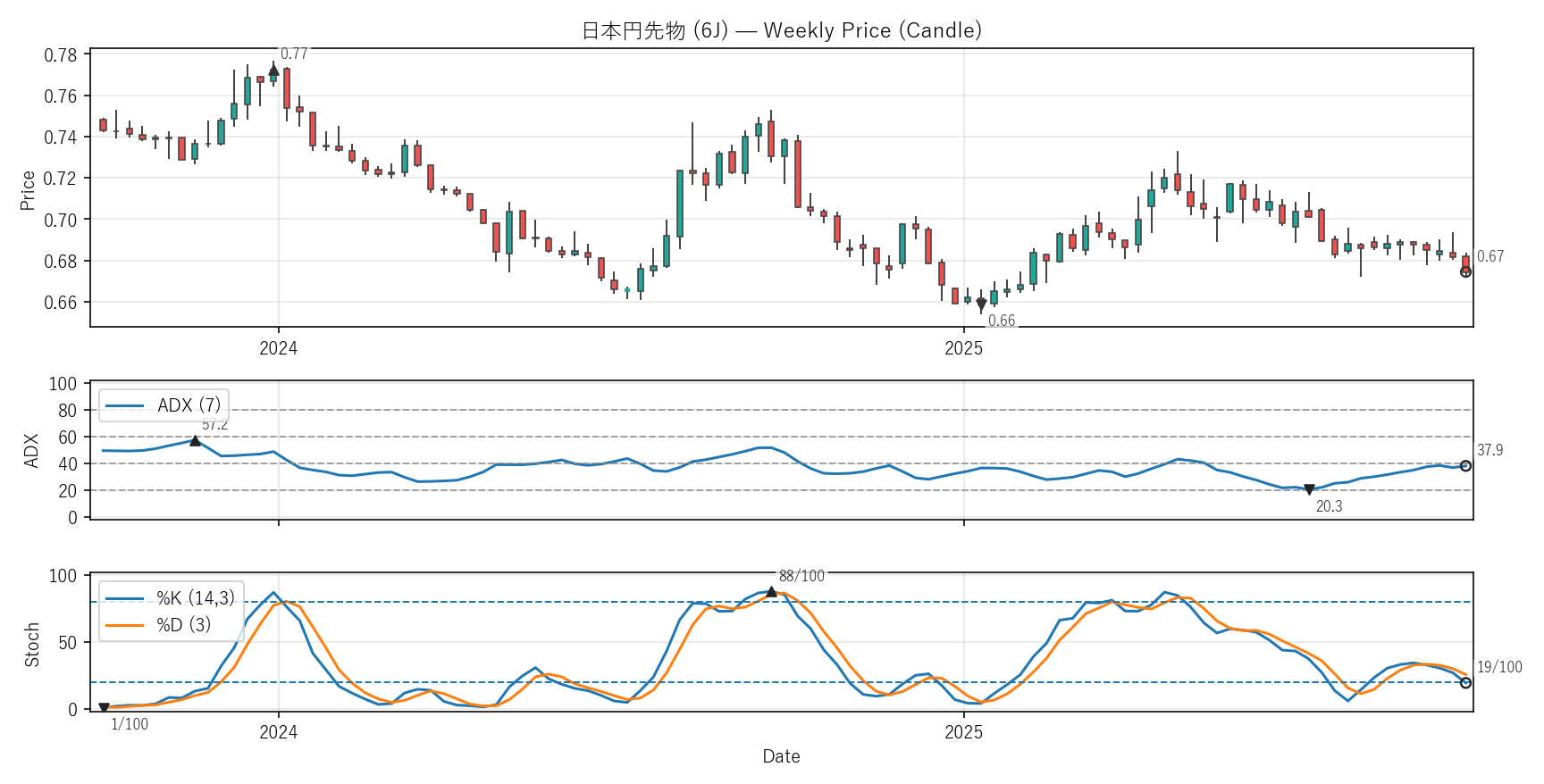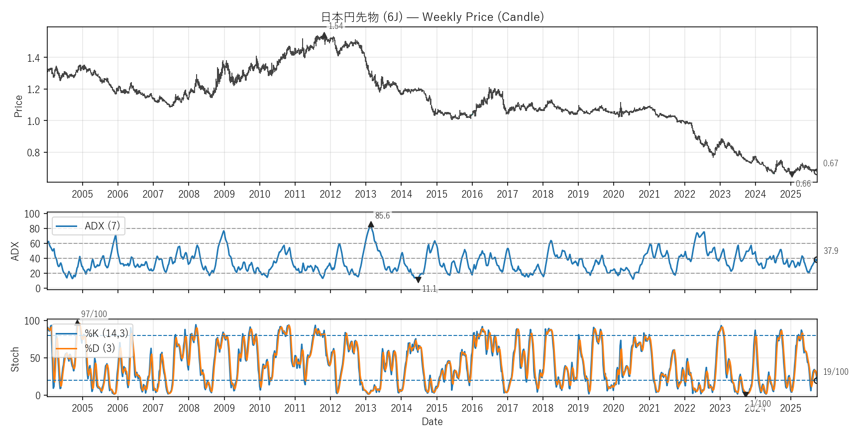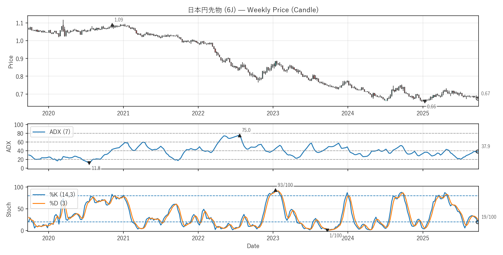 先週比(2025-09-26):週次リターン:-0.88%(終値 0.66 → 0.65) / ADX:+3.2pt(45 → 48)
