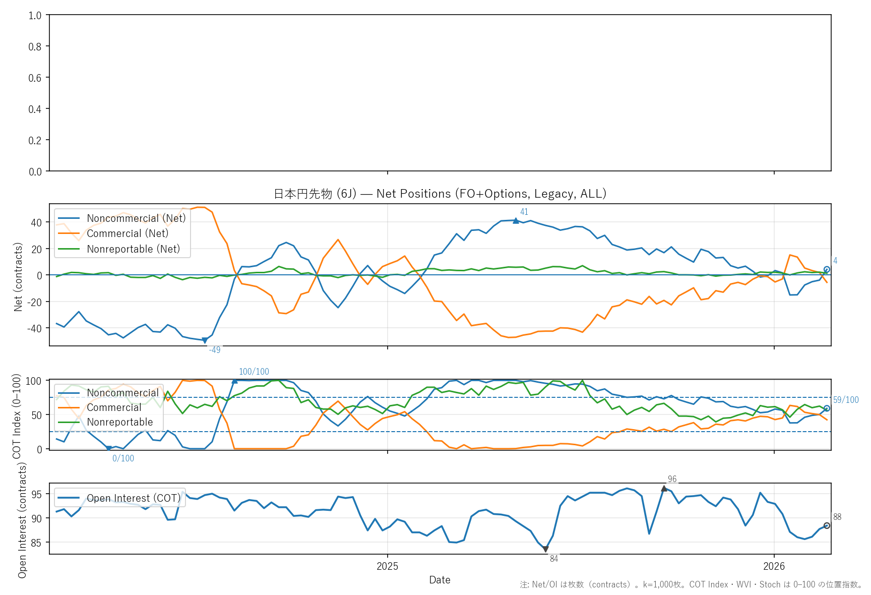 先週比(2026-02-20):非商業COT指数:+8pt(-4 → 4) / 商業COT指数:-7pt(2 → -6) / NR COT指数:-1pt(2 → 1) / Open Interest:+0.80%(88 → 88)