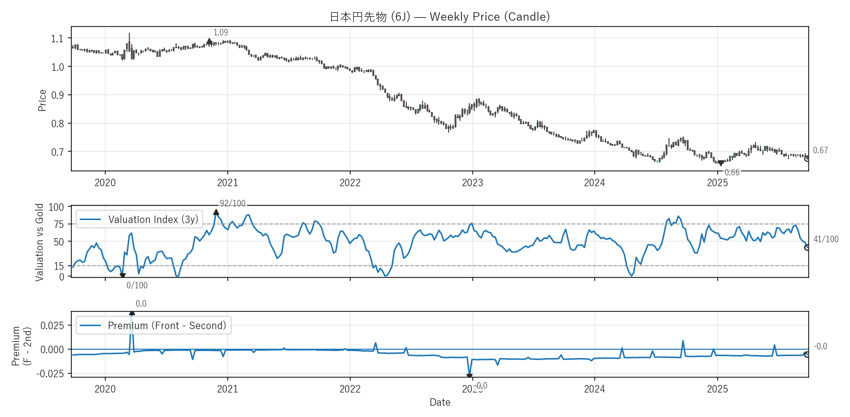 円/米ドル(JPY/USD)の先物。FX/CFD例: USDJPY(※逆)。注意: 先物はJPY/USDベースのため、USDJPY(ドル円)とは逆方向に動く。