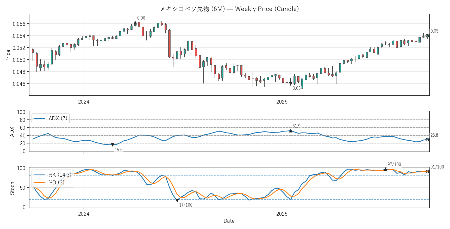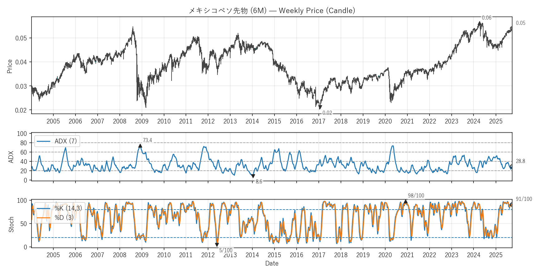 テクニカルは勢い(ADX)と位置(Stoch %K)。ADXは20超=発生、40超=強め。Stochは0〜100で80以上/20以下が目安。