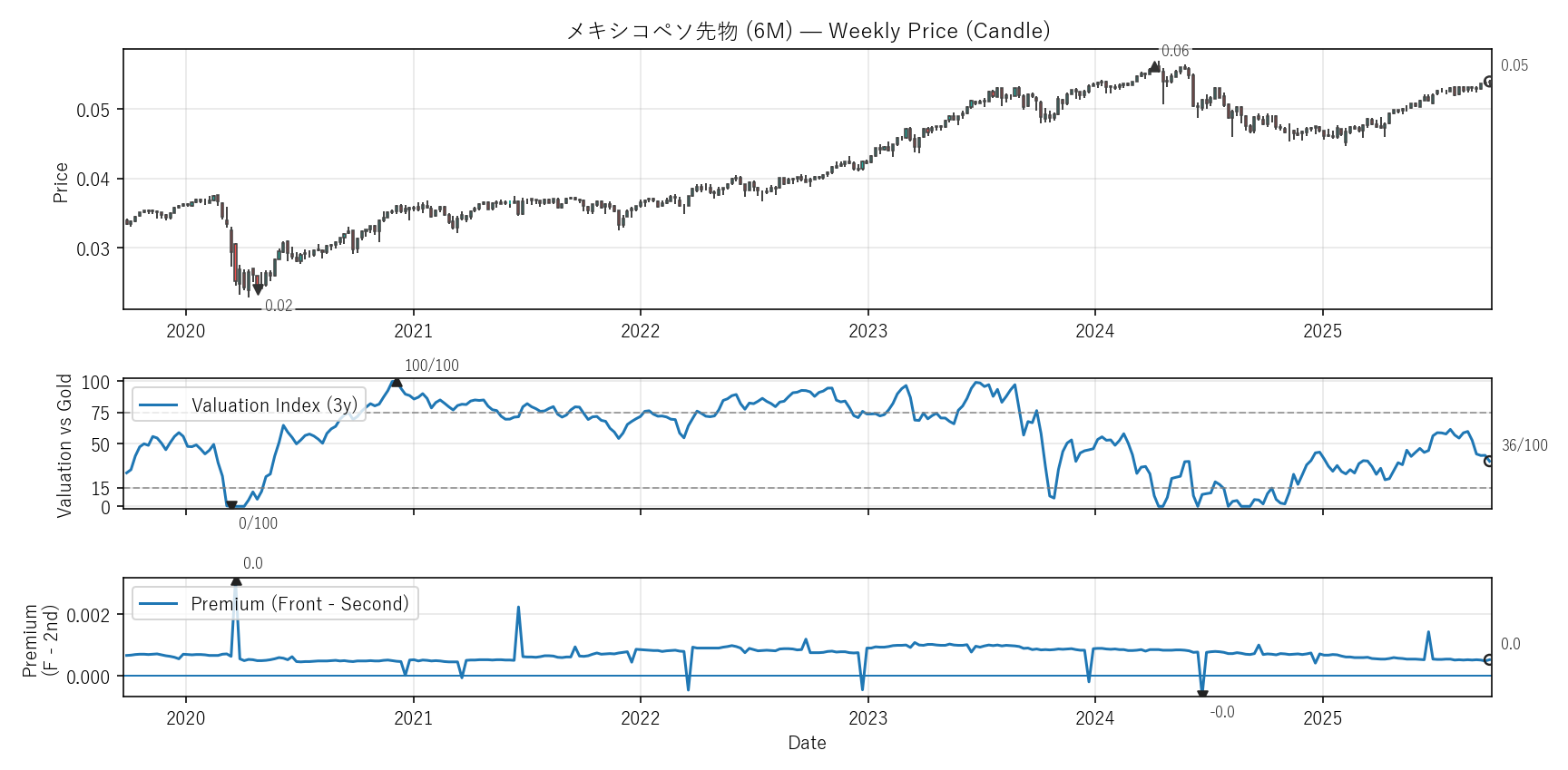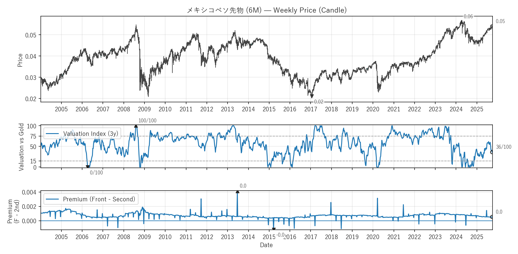 Valuation(WVI)は「基準資産と比べて相対的に高い/安いか」をみる指標。通常は金(GC)、金自身は米30年債(ZB)と比較。価格比(対象/参照×100)を短期/長期EMAで平滑化→差(PAL)の過去位置を0〜100で表示。PremiumはFront−Second(順鞘/逆鞘)。