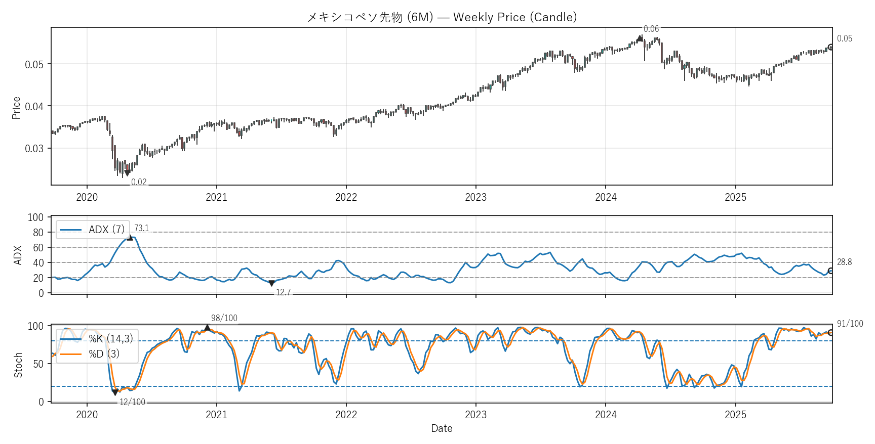 メキシコペソ/米ドルの先物。米国景気・金利・原油の影響。