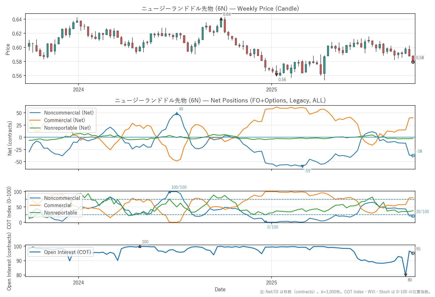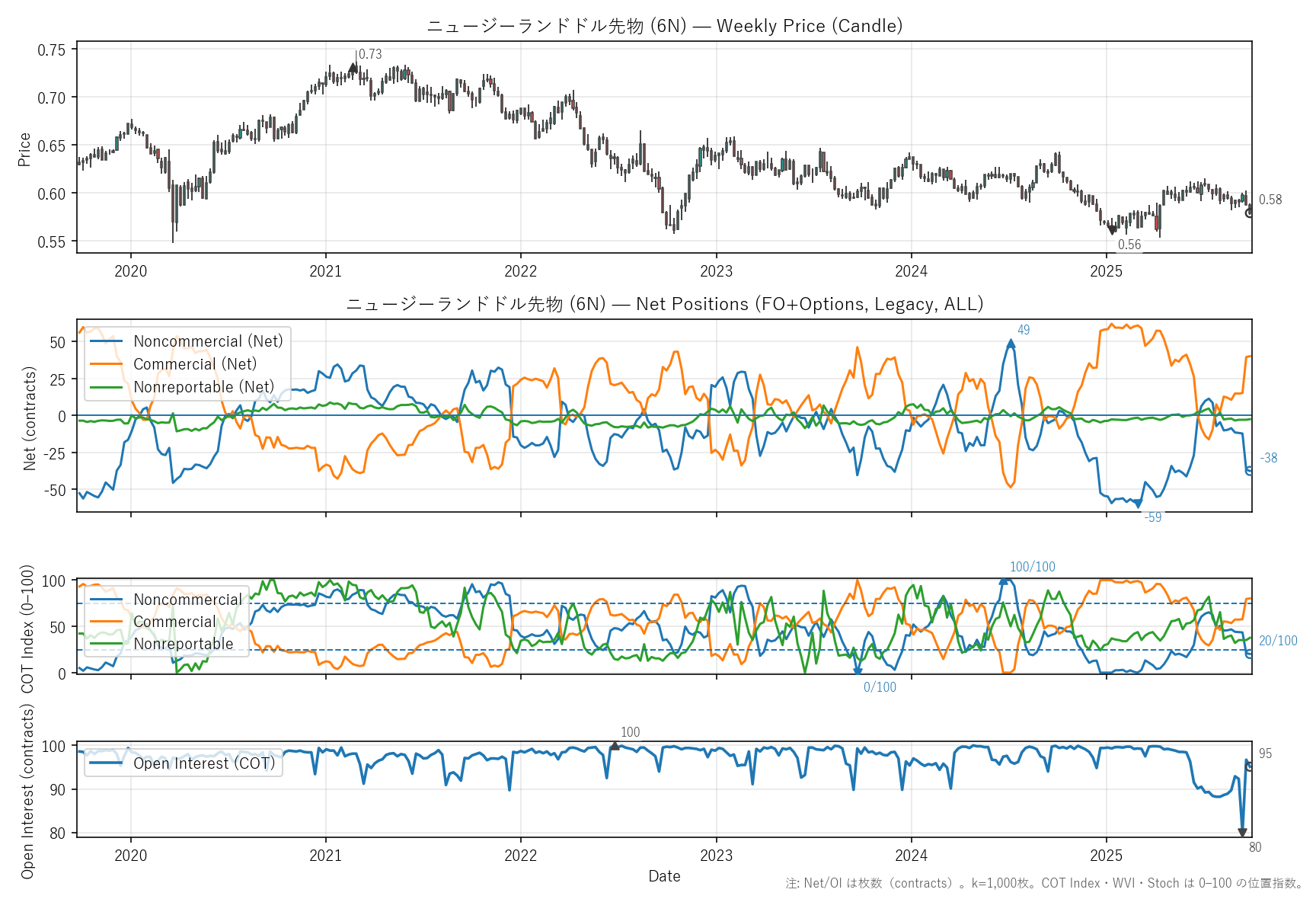 先週比(2025-09-26):非商業COT指数:-1pt(-37 → -38) / 商業COT指数:+1pt(40 → 40) / NR COT指数:+0pt(-3 → -2) / Open Interest:-1.65%(97 → 95)