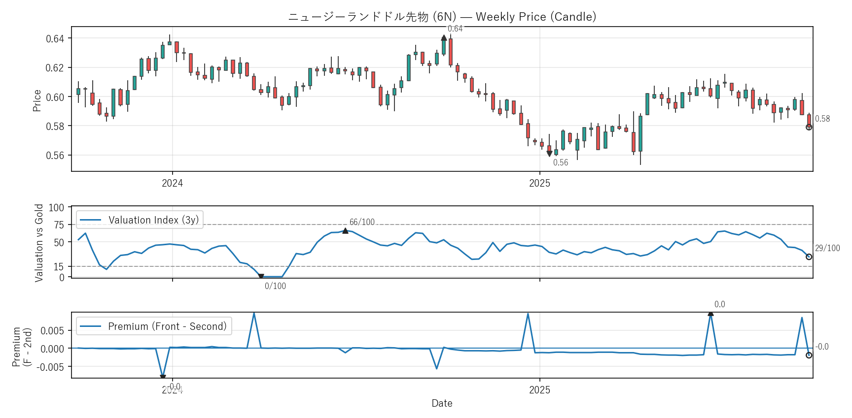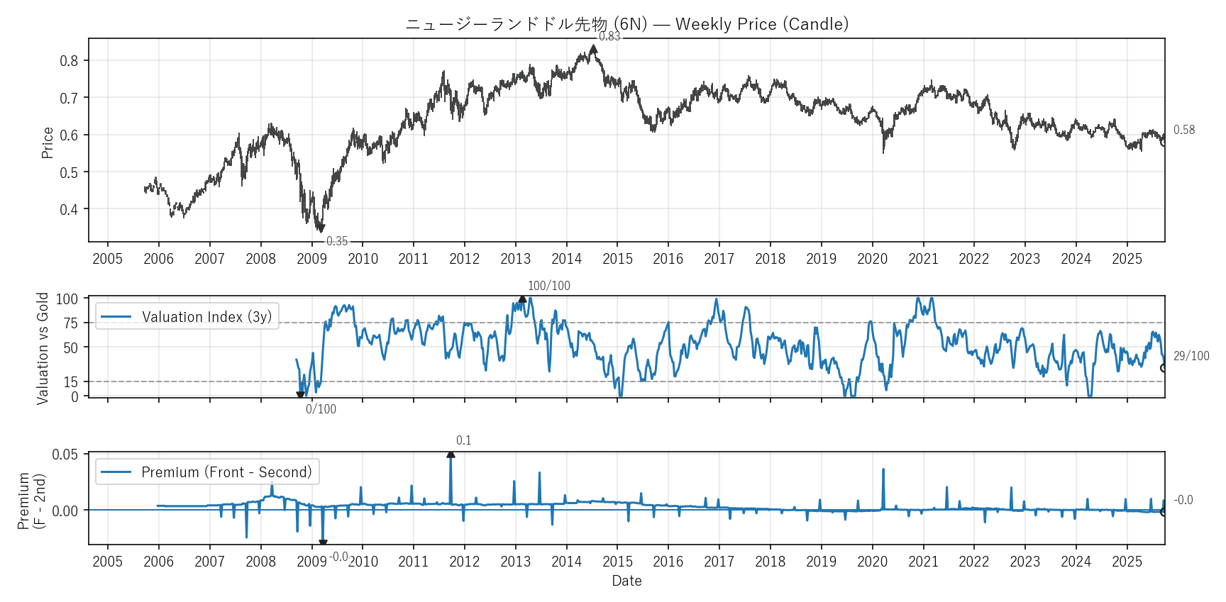 Valuation(WVI)は「基準資産と比べて相対的に高い/安いか」をみる指標。通常は金(GC)、金自身は米30年債(ZB)と比較。価格比(対象/参照×100)を短期/長期EMAで平滑化→差(PAL)の過去位置を0〜100で表示。PremiumはFront−Second(順鞘/逆鞘)。