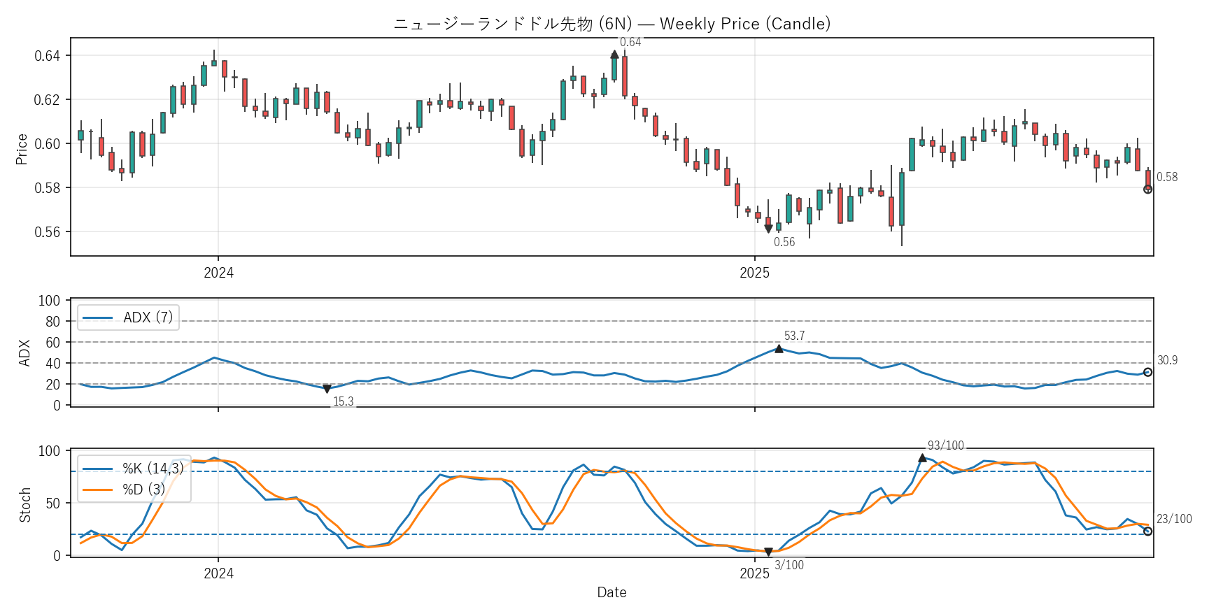 ADX:30.9(15.3〜53.7)|位置 41/100 / Stoch %K:23(3〜93)|位置 22/100