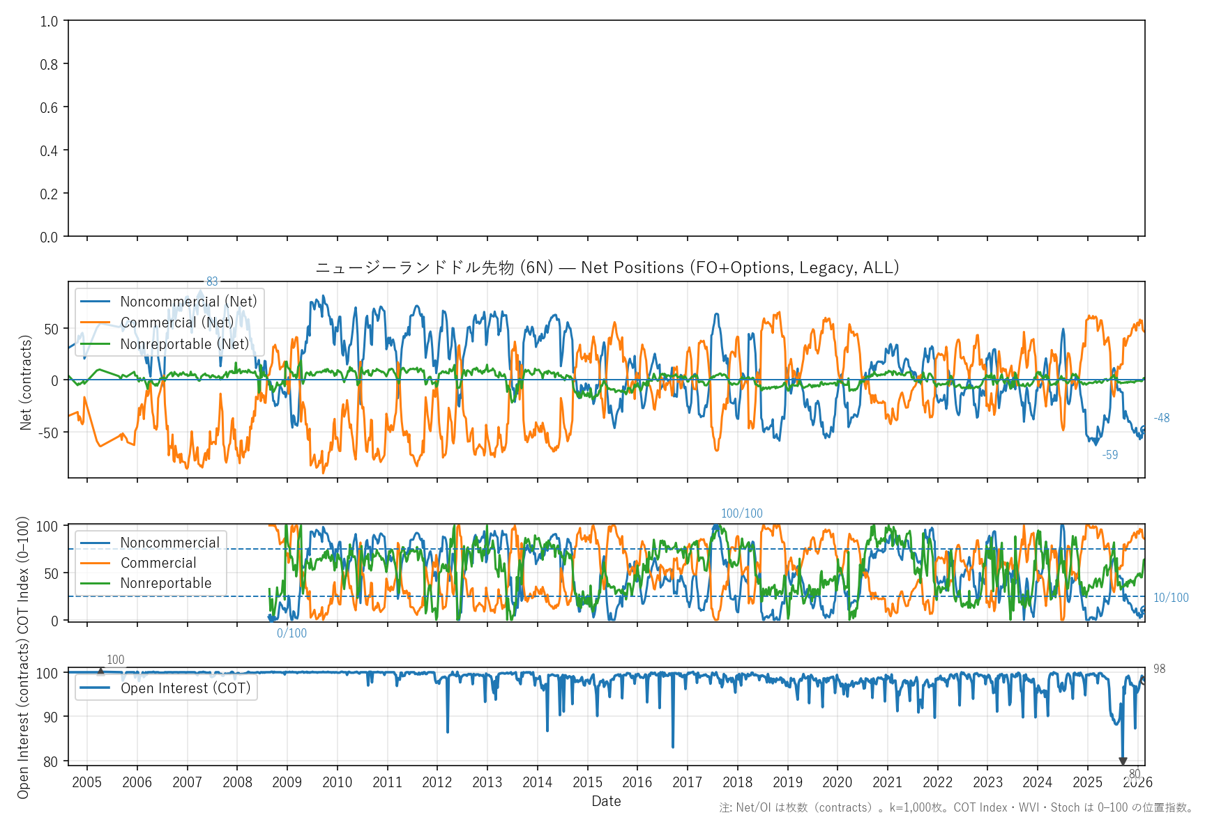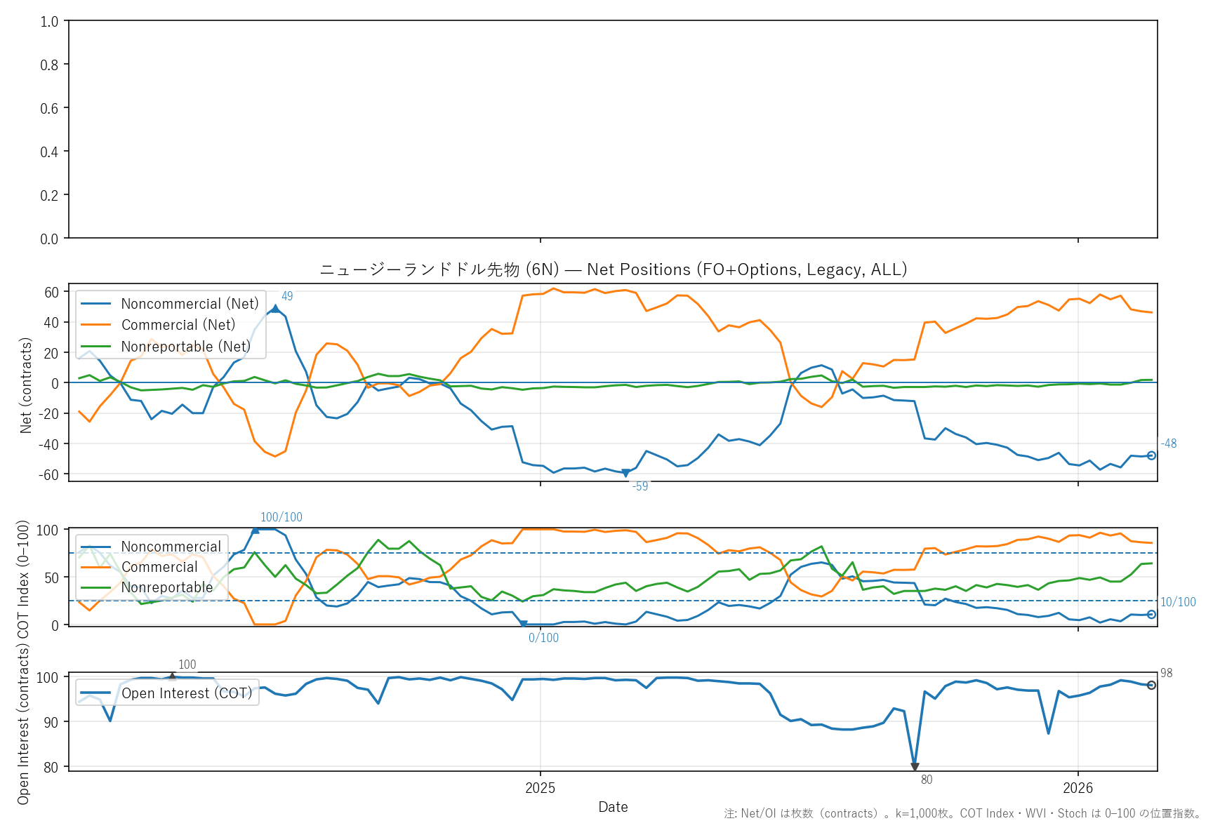 先週比(2026-02-20):非商業COT指数:+1pt(-49 → -48) / 商業COT指数:-1pt(47 → 46) / NR COT指数:+0pt(2 → 2) / Open Interest:-0.20%(98 → 98)