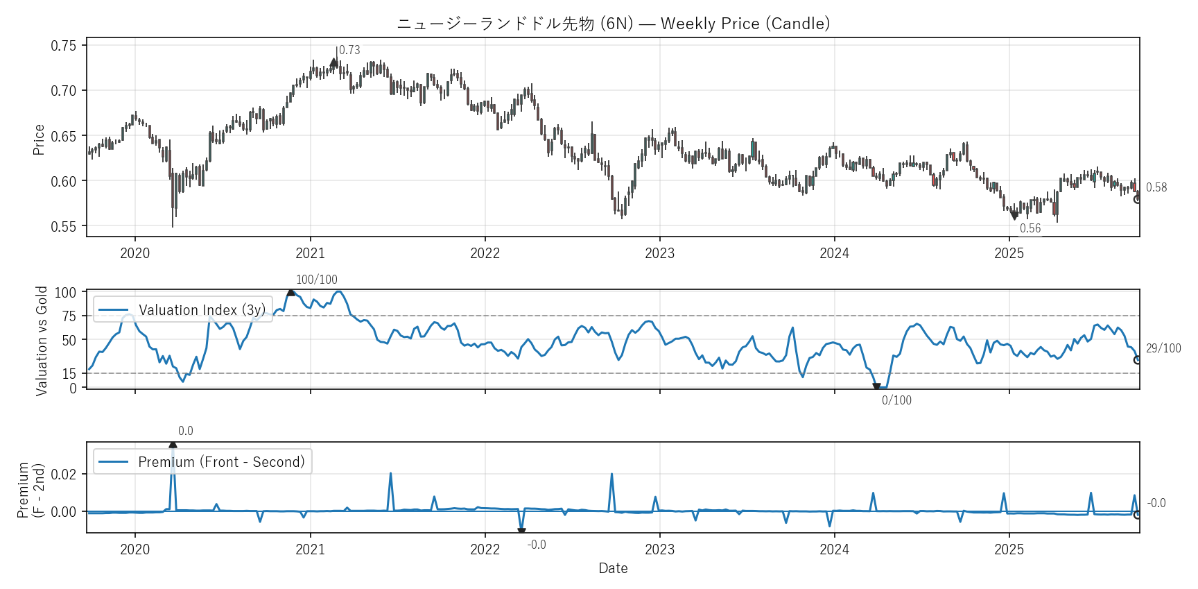 ニュージーランドドル/米ドルの先物。乳製品・金利差の影響が大きい。