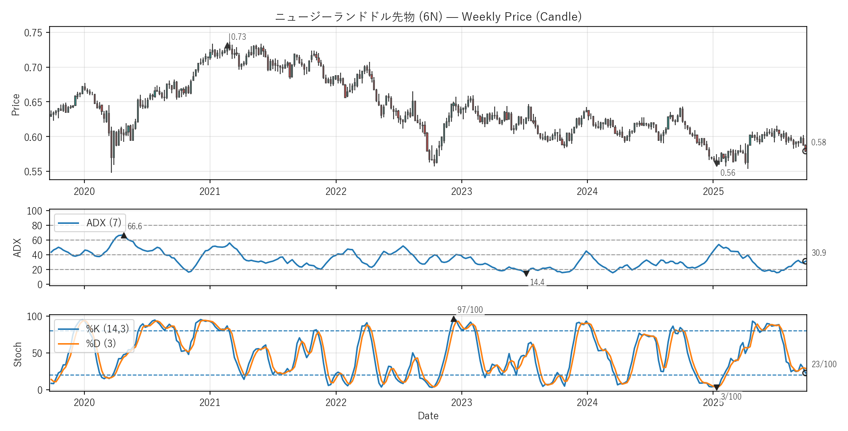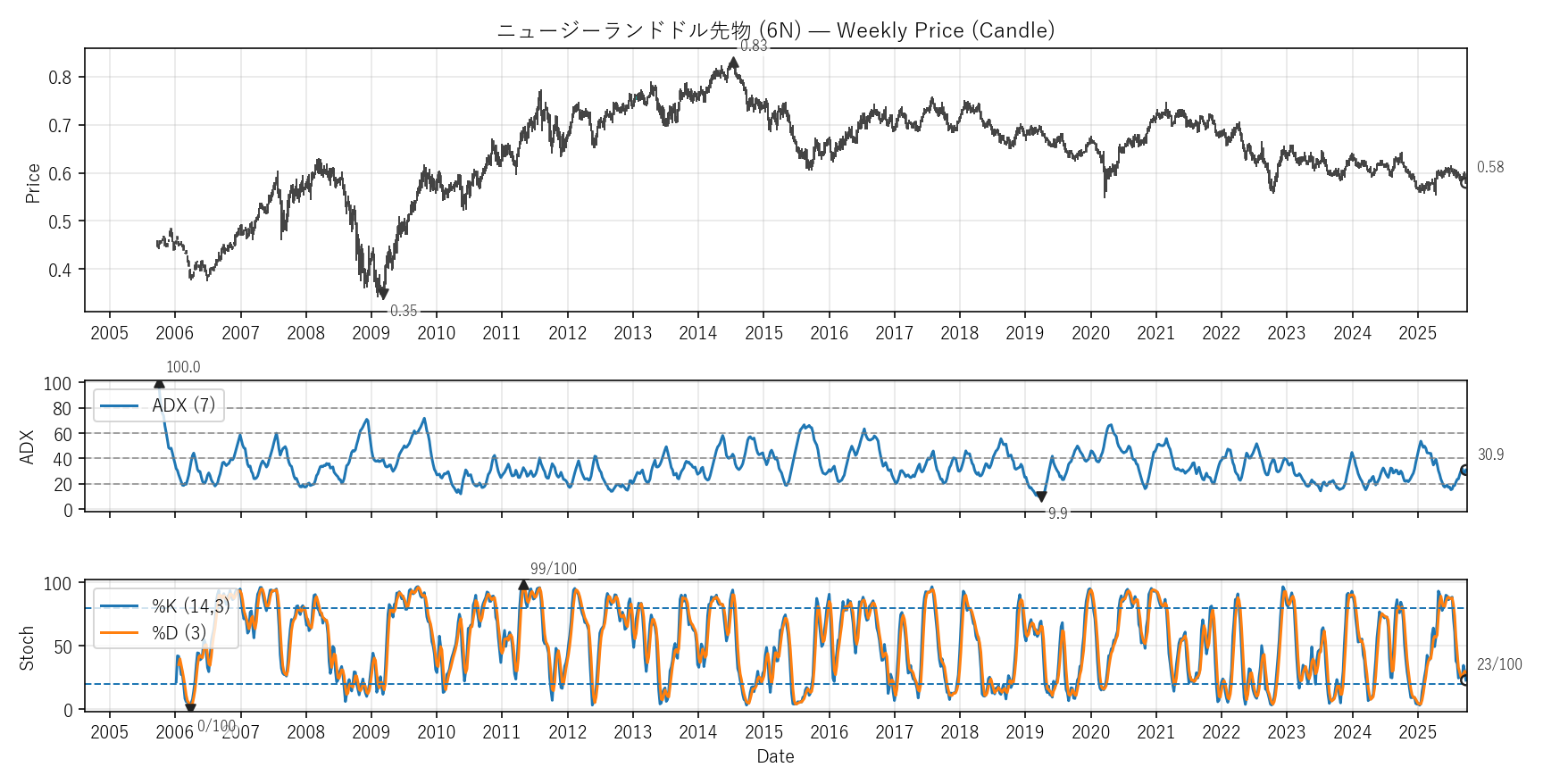 テクニカルは勢い(ADX)と位置(Stoch %K)。ADXは20超=発生、40超=強め。Stochは0〜100で80以上/20以下が目安。