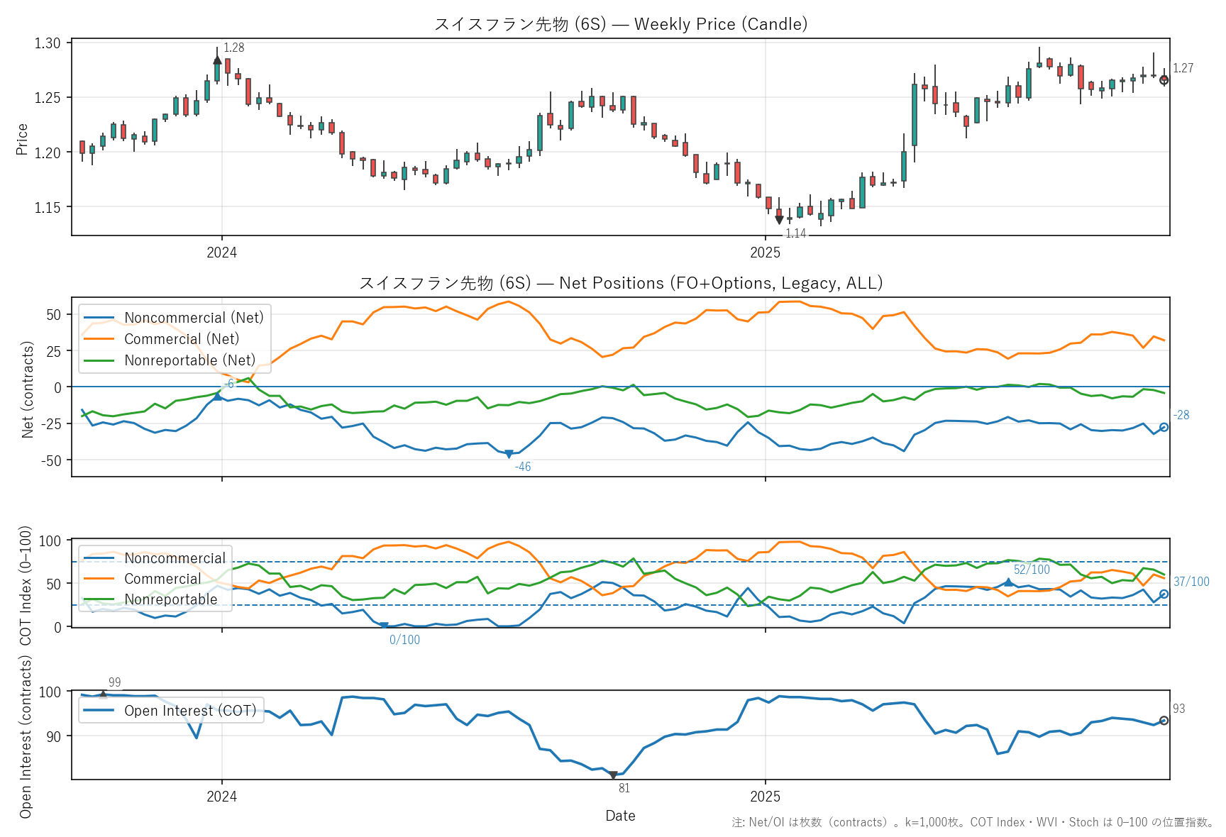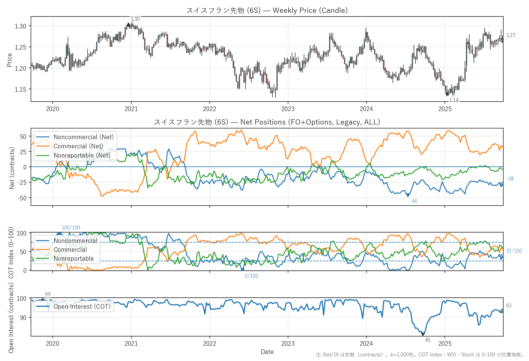 先週比(2025-09-26):非商業COT指数:+5pt(-32 → -28) / 商業COT指数:-3pt(35 → 32) / NR COT指数:-2pt(-2 → -4) / Open Interest:+1.08%(92 → 93)