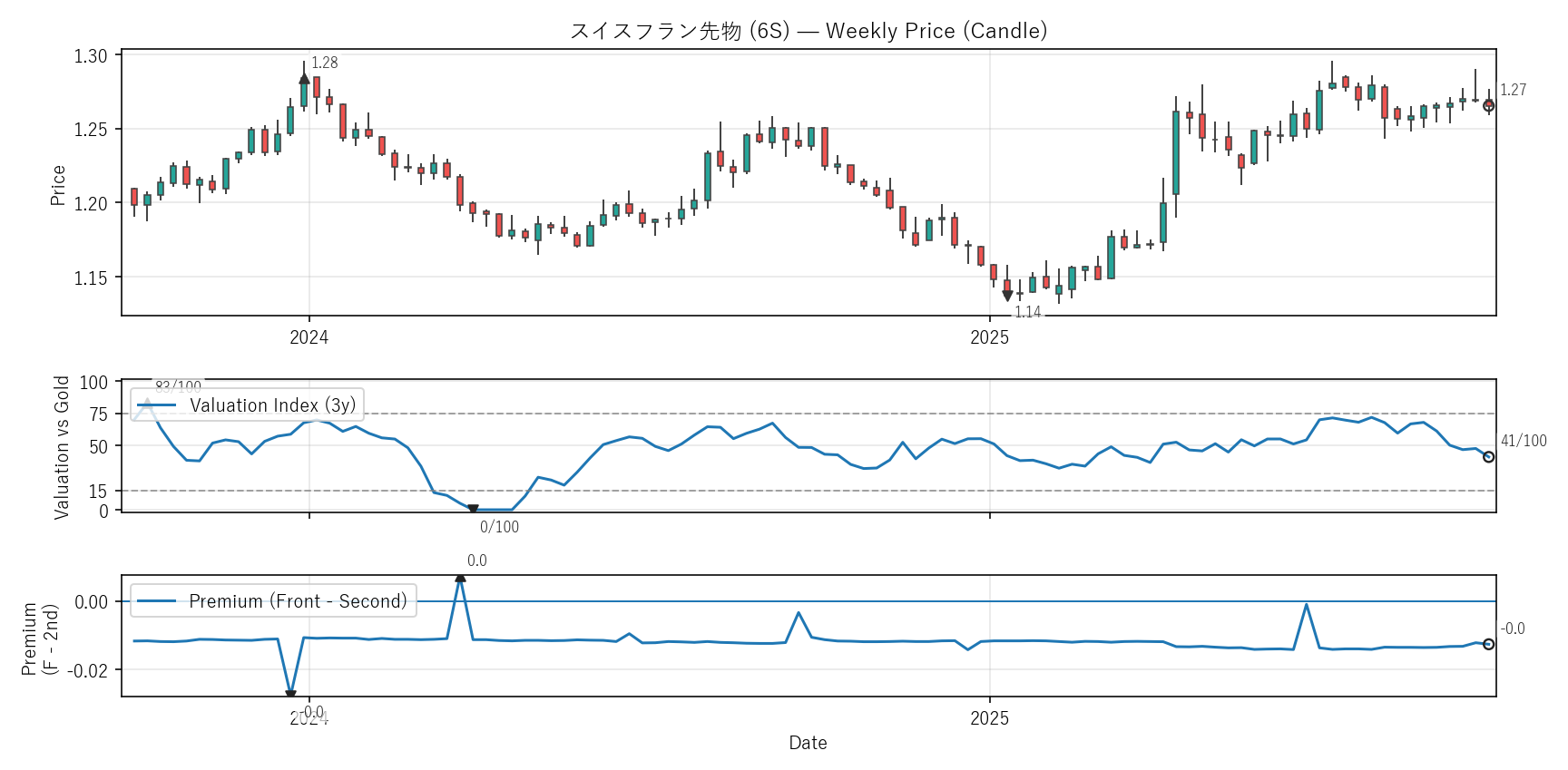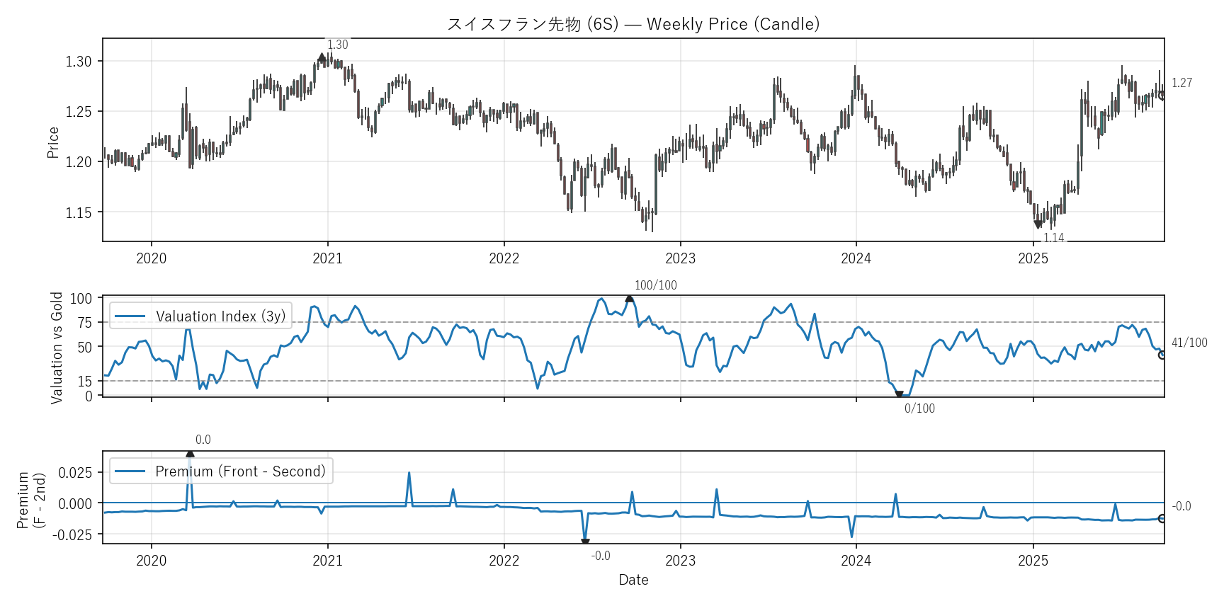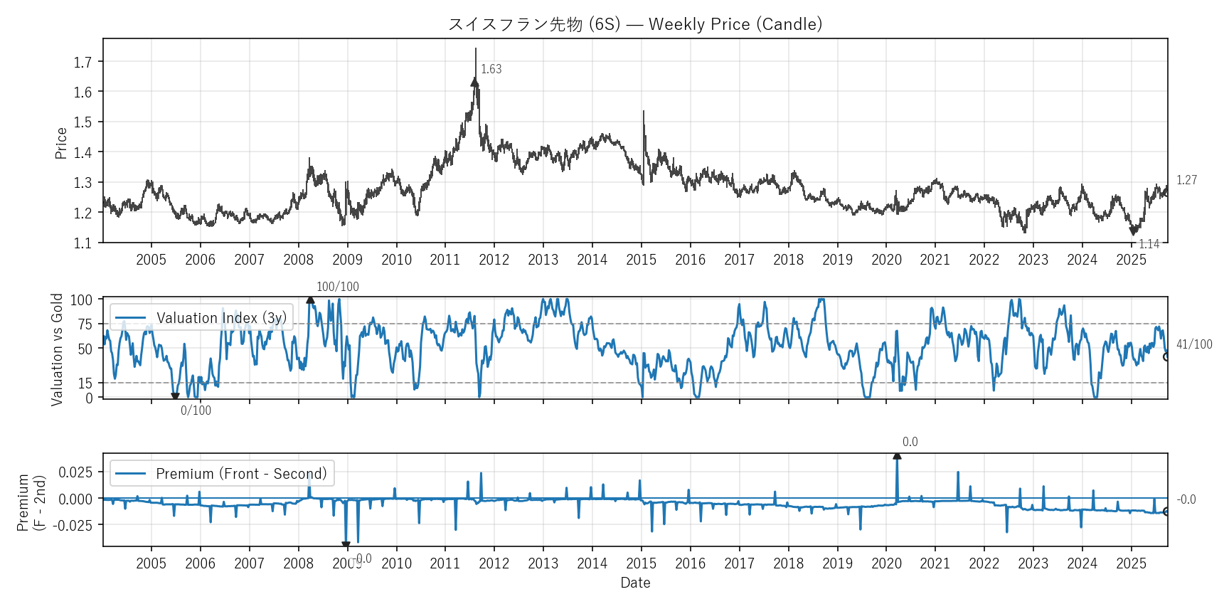 Valuation(WVI)は「基準資産と比べて相対的に高い/安いか」をみる指標。通常は金(GC)、金自身は米30年債(ZB)と比較。価格比(対象/参照×100)を短期/長期EMAで平滑化→差(PAL)の過去位置を0〜100で表示。PremiumはFront−Second(順鞘/逆鞘)。