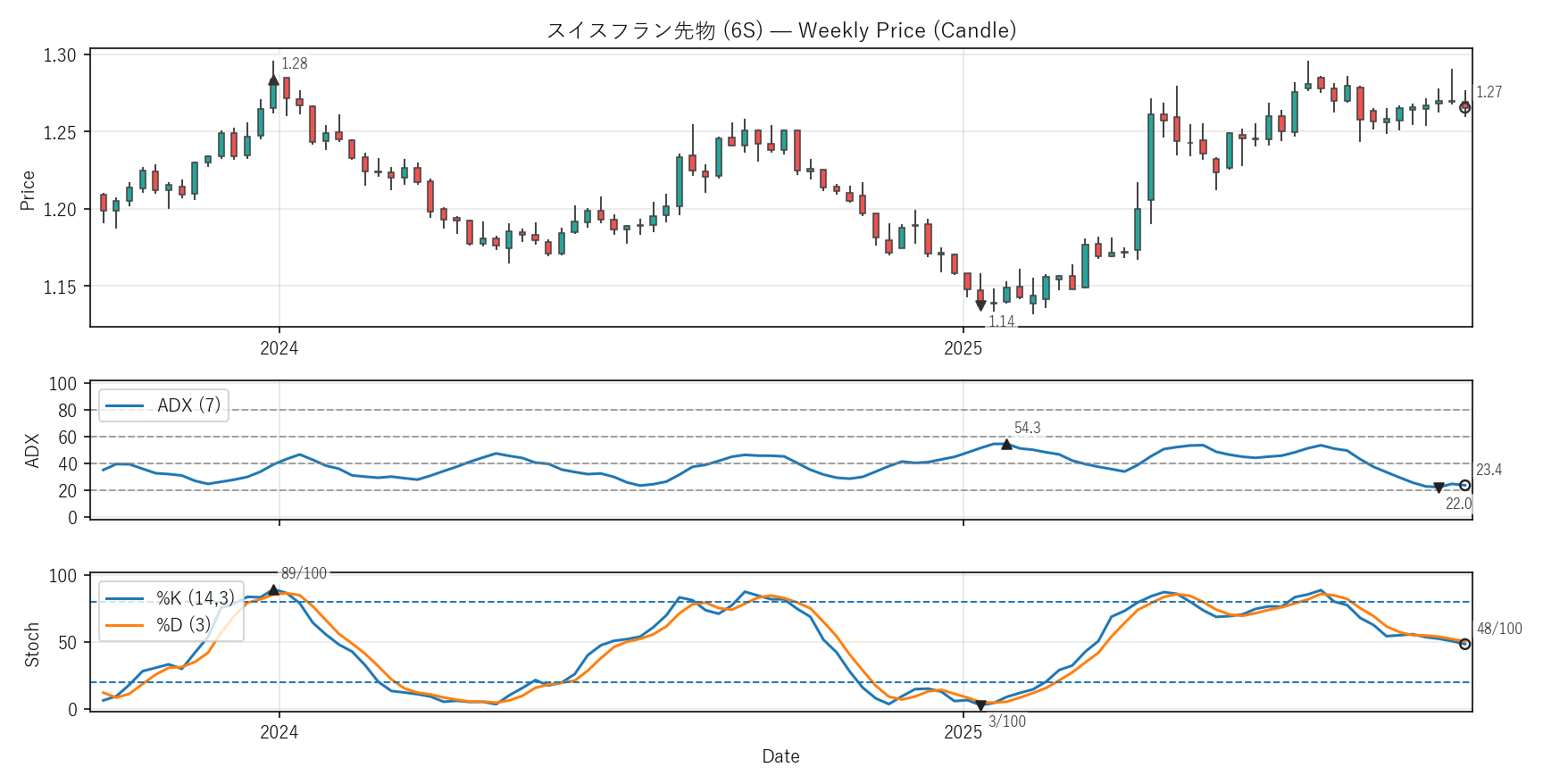 ADX:23.4(22.0〜54.3)|位置 4/100 / Stoch %K:48(3〜89)|位置 53/100