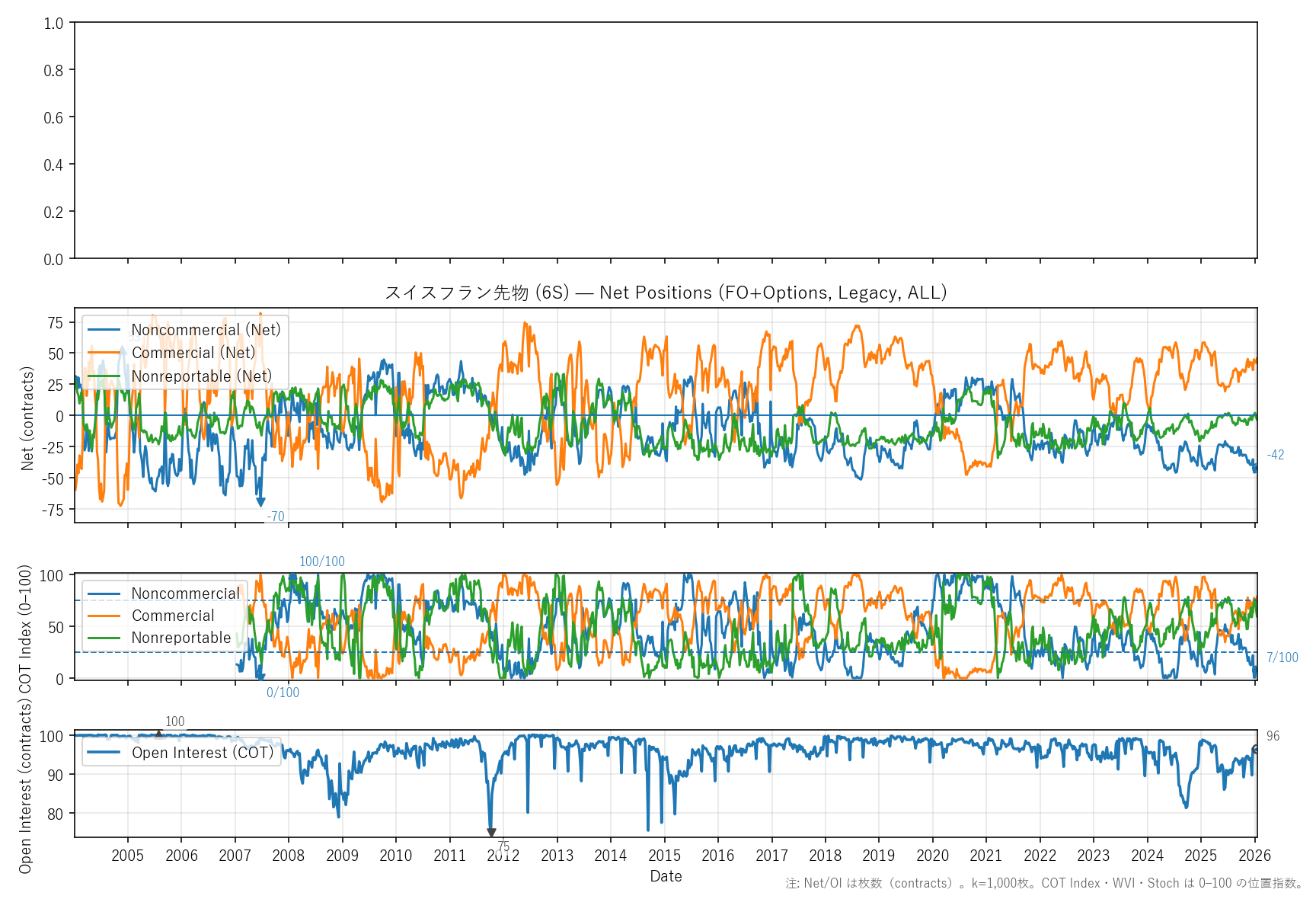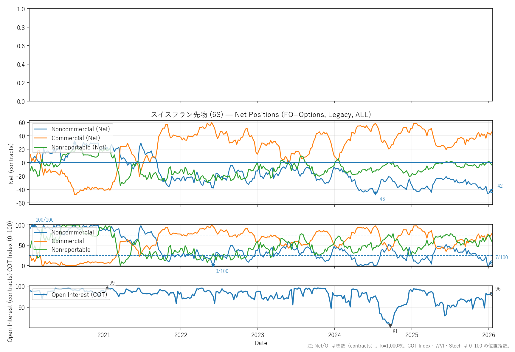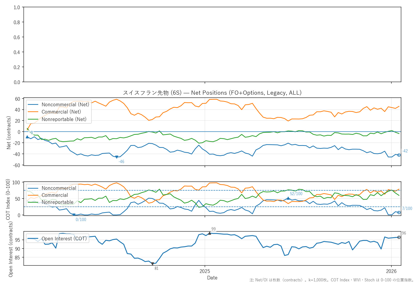 先週比(2026-01-16):非商業COT指数:-1pt(-41 → -42) / 商業COT指数:+4pt(42 → 46) / NR COT指数:-2pt(-1 → -3) / Open Interest:+0.10%(96 → 96)