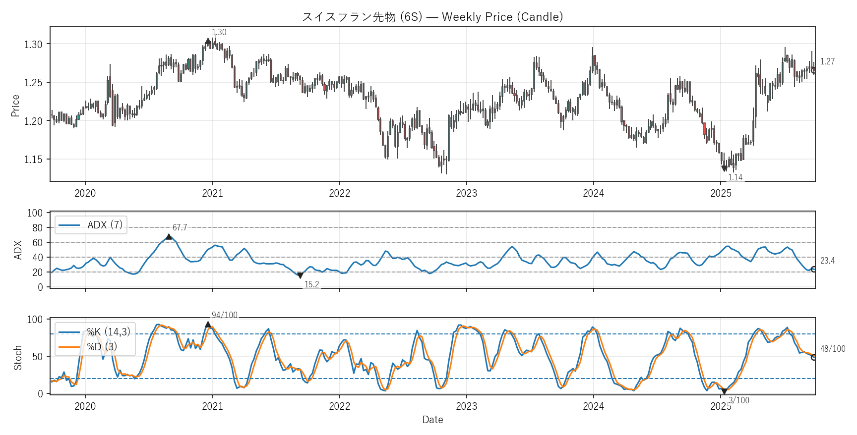 先週比(2025-09-26):週次リターン:-1.19%(終値 1.26 → 1.25) / ADX:-0.2pt(18 → 17)