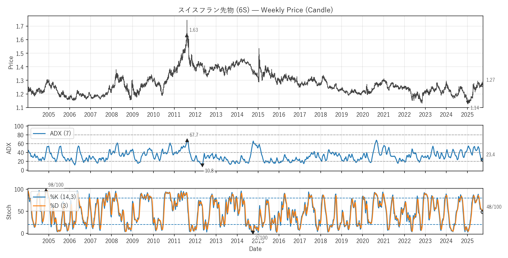 テクニカルは勢い(ADX)と位置(Stoch %K)。ADXは20超=発生、40超=強め。Stochは0〜100で80以上/20以下が目安。