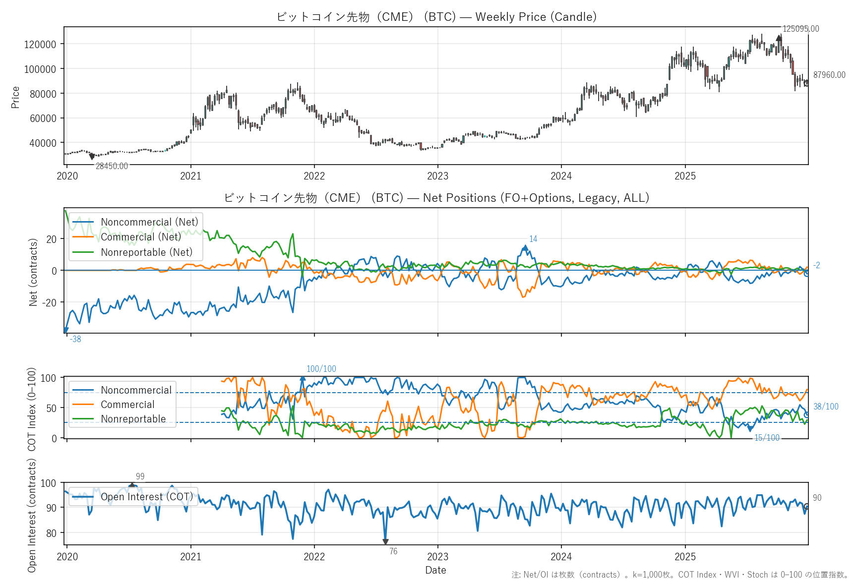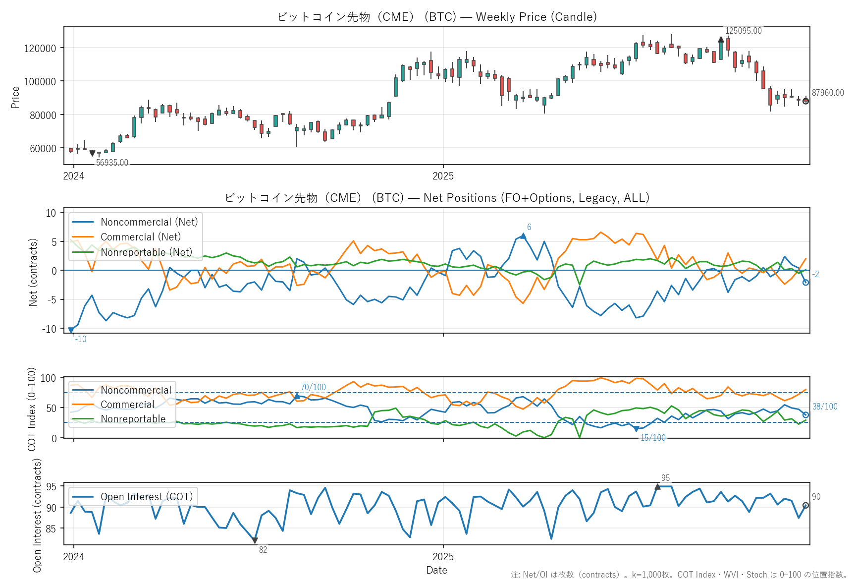 先週比(2025-12-26):非商業COT指数:-2pt(0 → -2) / 商業COT指数:+2pt(0 → 2) / NR COT指数:+1pt(-0 → 0) / Open Interest:+3.43%(87 → 90)