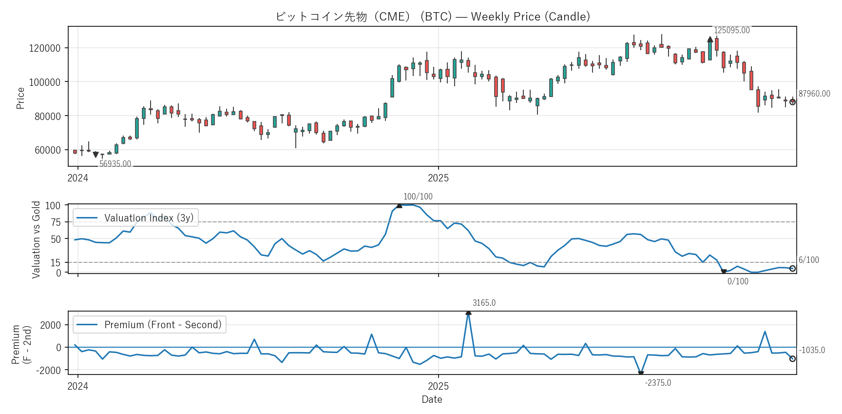 先週比(2025-12-26):Valuation:+7.9pt(6 → 13) / Premium:-575.0(-460.0 → -1035.0)