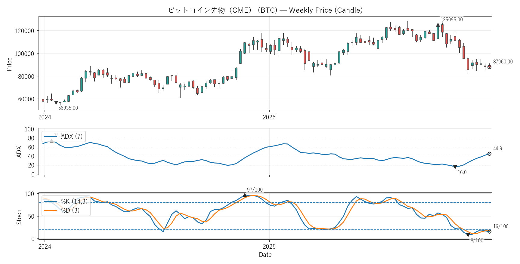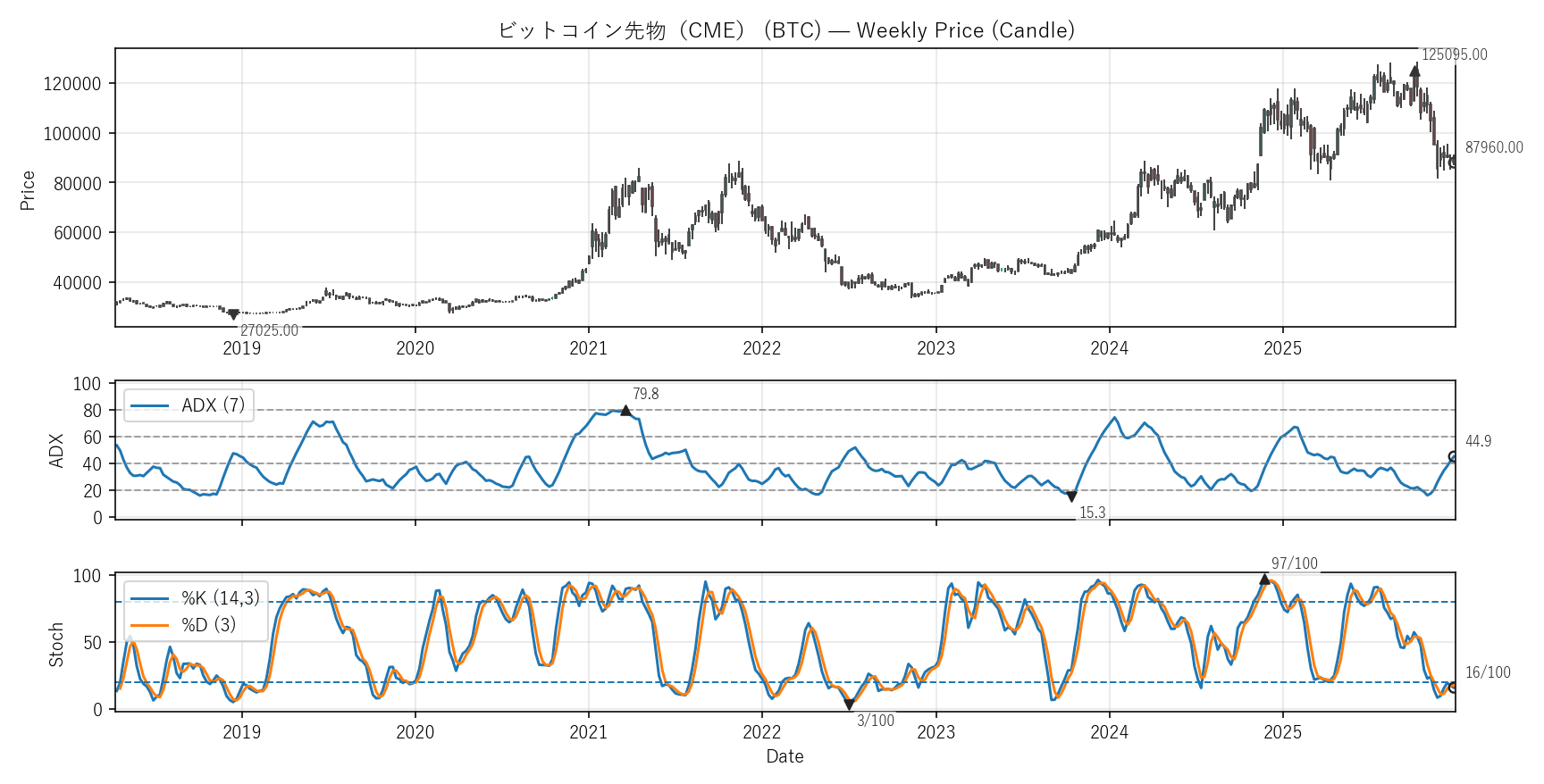 先週比(2025-12-26):週次リターン:+2.54%(終値 87960.00 → 90190.00) / ADX:+2.3pt(45 → 47)