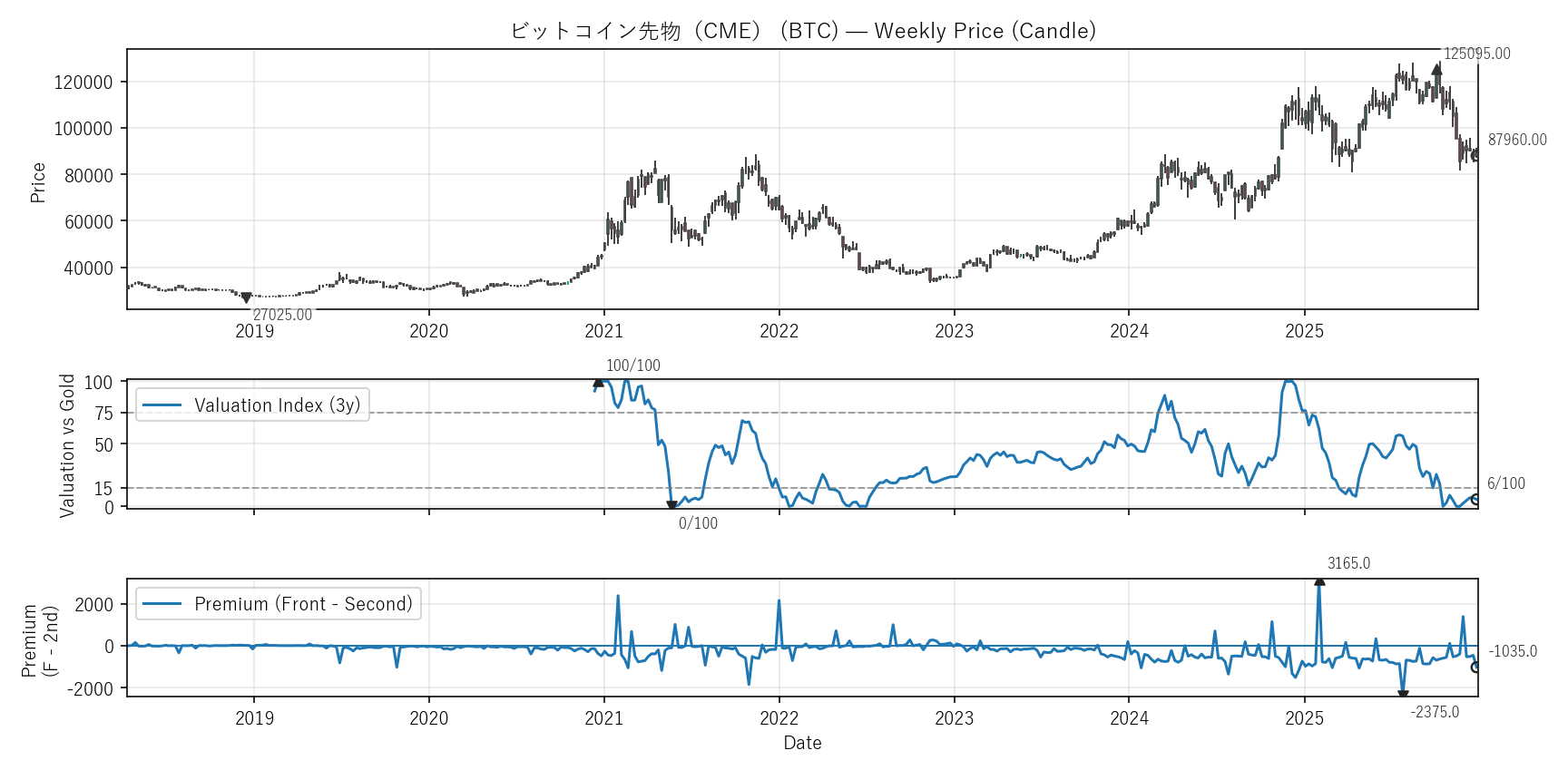 Valuation(WVI)は「基準資産と比べて相対的に高い/安いか」をみる指標。通常は金(GC)、金自身は米30年債(ZB)と比較。価格比(対象/参照×100)を短期/長期EMAで平滑化→差(PAL)の過去位置を0〜100で表示。PremiumはFront−Second(順鞘/逆鞘)。