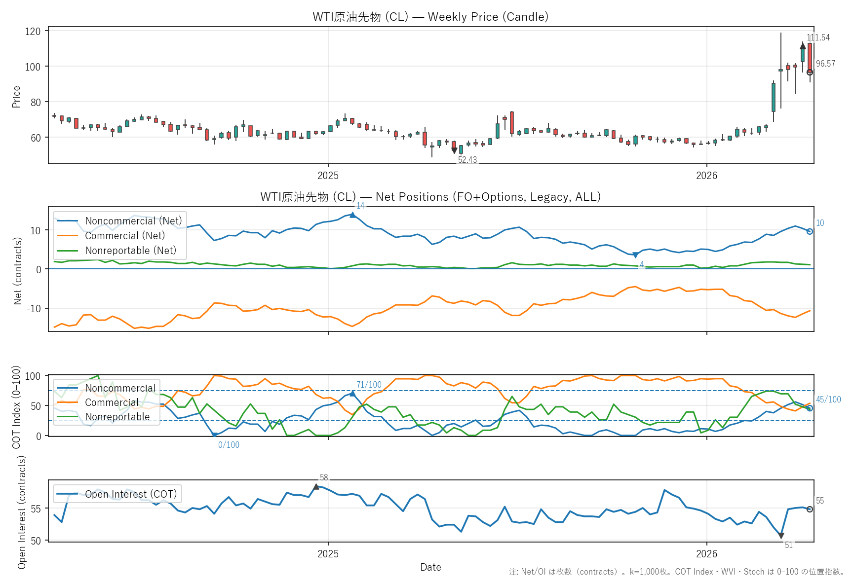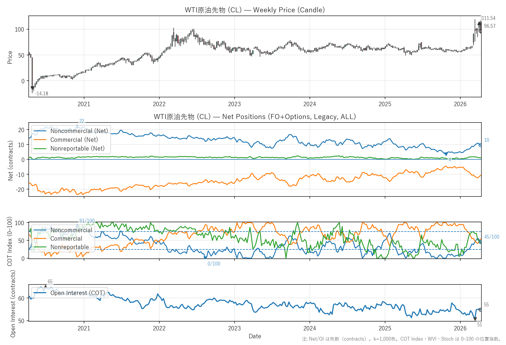 先週比(2026-04-10):非商業COT指数:-1pt(10 → 10) / 商業COT指数:+1pt(-12 → -11) / NR COT指数:-0pt(1 → 1) / Open Interest:-0.54%(55 → 55)