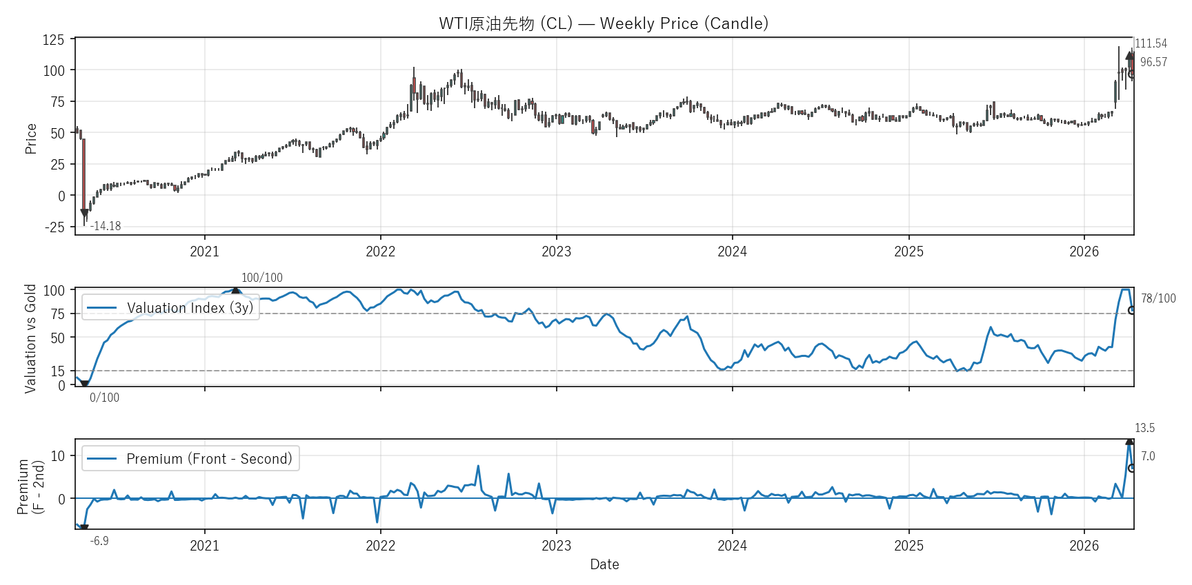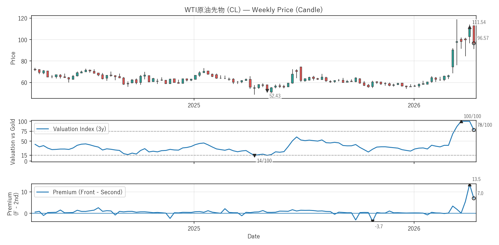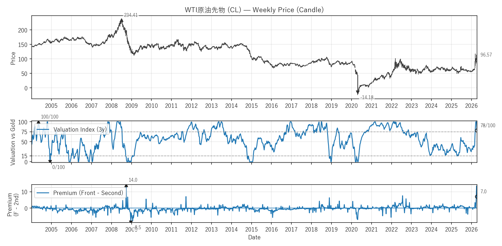 Valuation(WVI)は「基準資産と比べて相対的に高い/安いか」をみる指標。通常は金(GC)、金自身は米30年債(ZB)と比較。価格比(対象/参照×100)を短期/長期EMAで平滑化→差(PAL)の過去位置を0〜100で表示。PremiumはFront−Second(順鞘/逆鞘)。