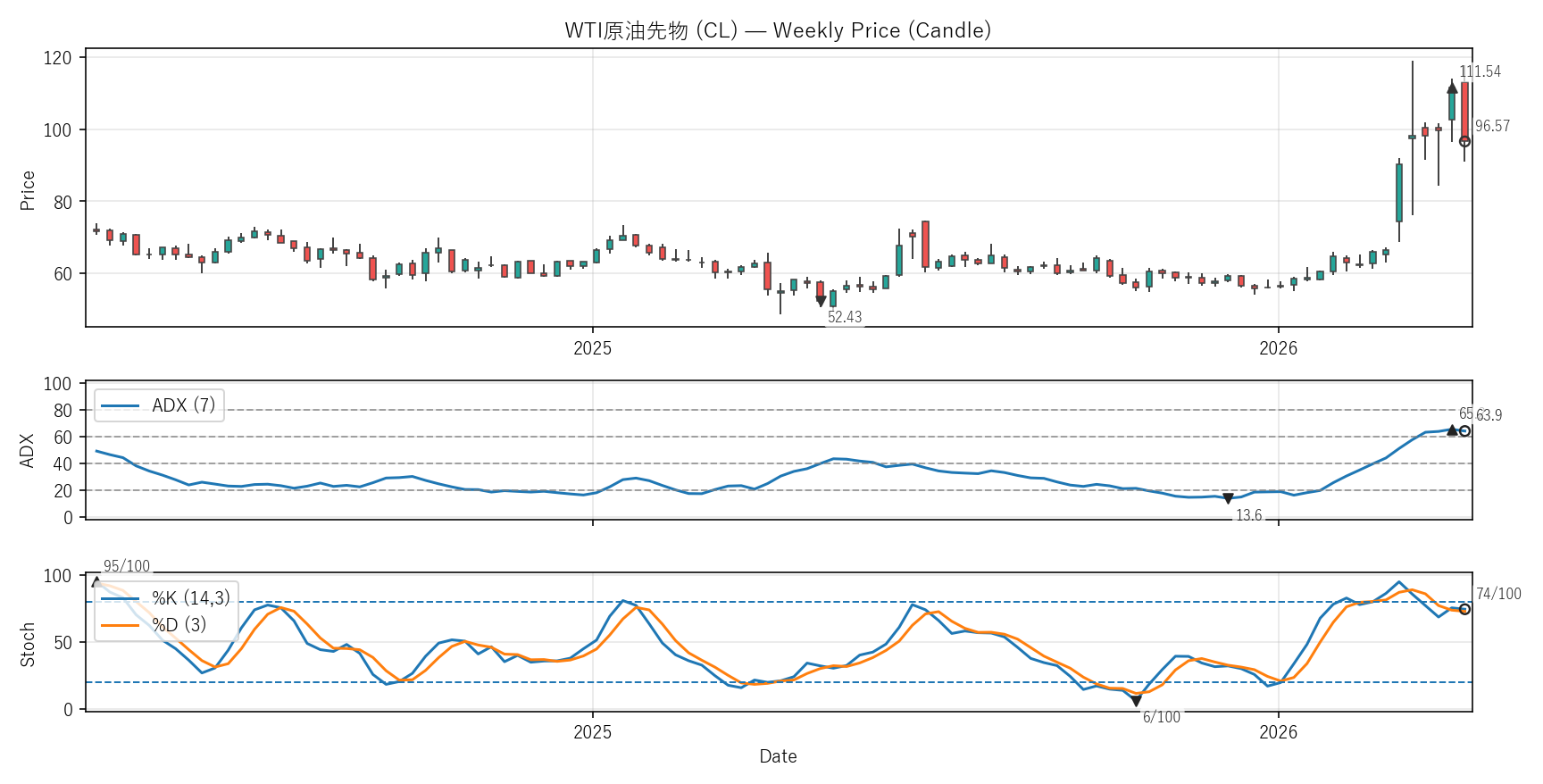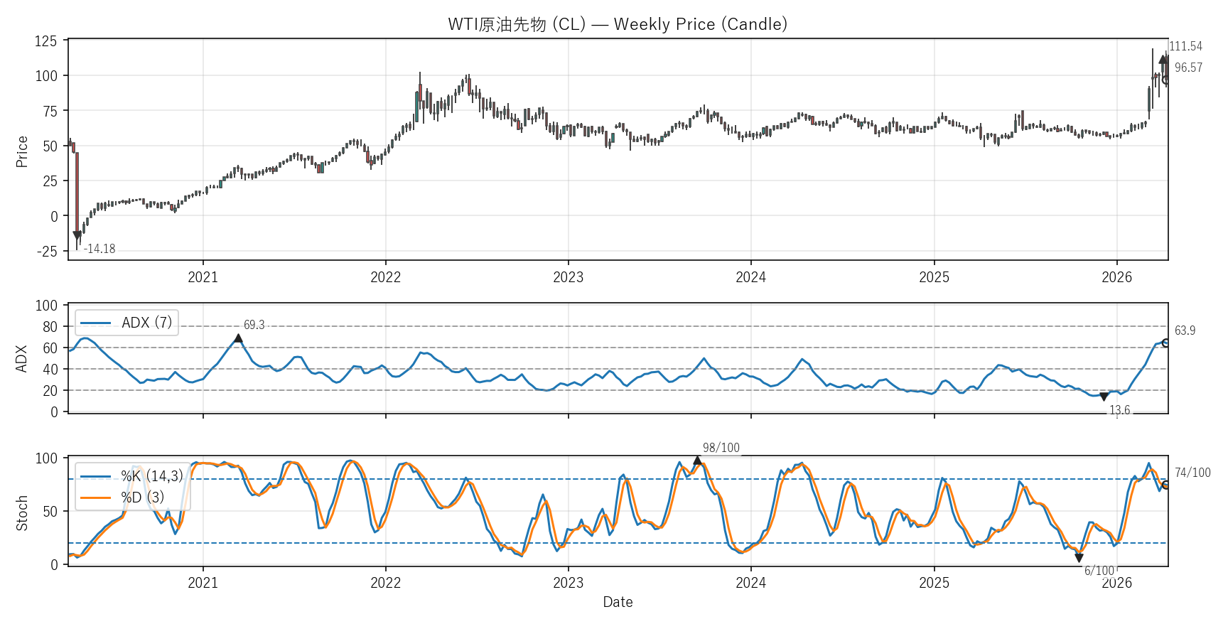先週比(2026-04-10):週次リターン:-5.47%(終値 96.57 → 91.29) / ADX:-3.1pt(64 → 61)