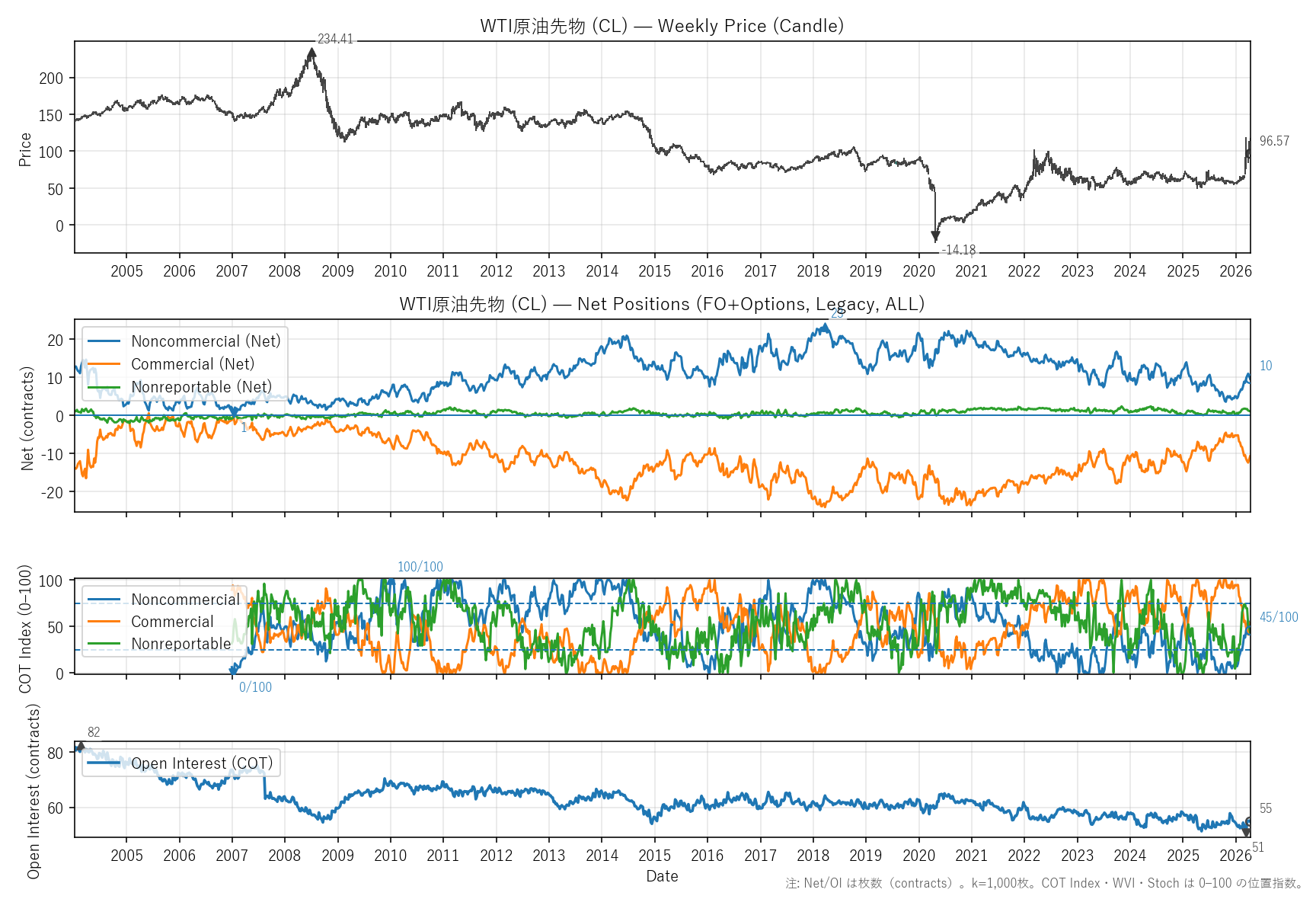 COTは、先物市場で「誰がどれくらい買い(ロング)・売り(ショート)を持っているか」をCFTCが毎週公表するデータです。①COT指数(0〜100)=約3年の範囲での位置、②Net=ロング−ショート、③OI=未決済建玉枚数(本サイトは3者のLONG合計で近似)。