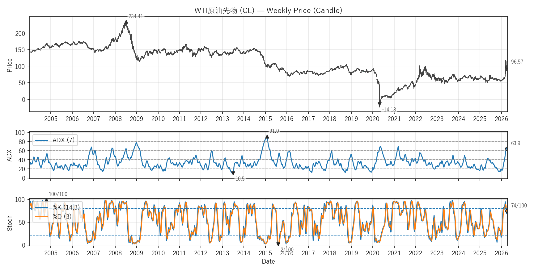 テクニカルは勢い(ADX)と位置(Stoch %K)。ADXは20超=発生、40超=強め。Stochは0〜100で80以上/20以下が目安。