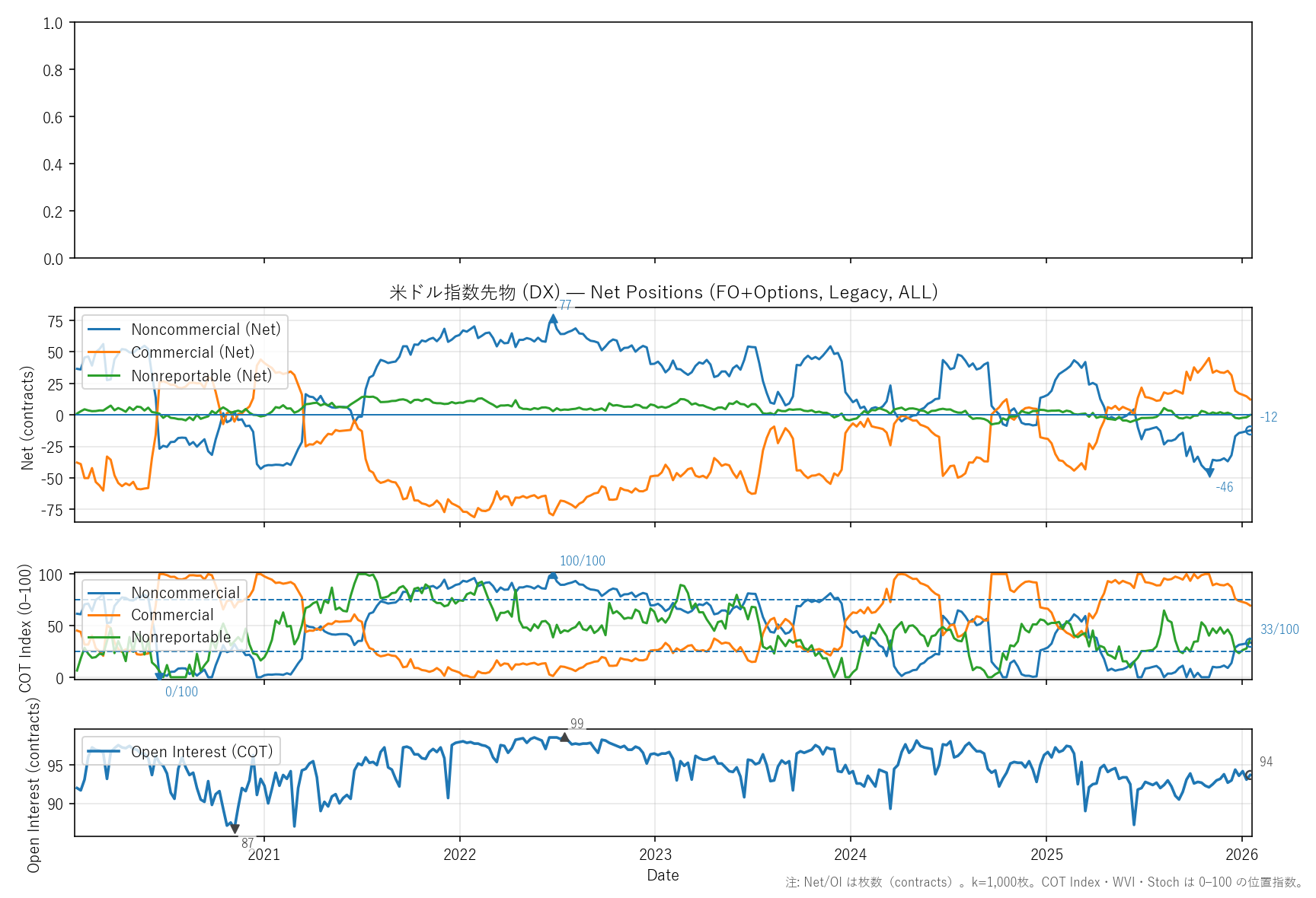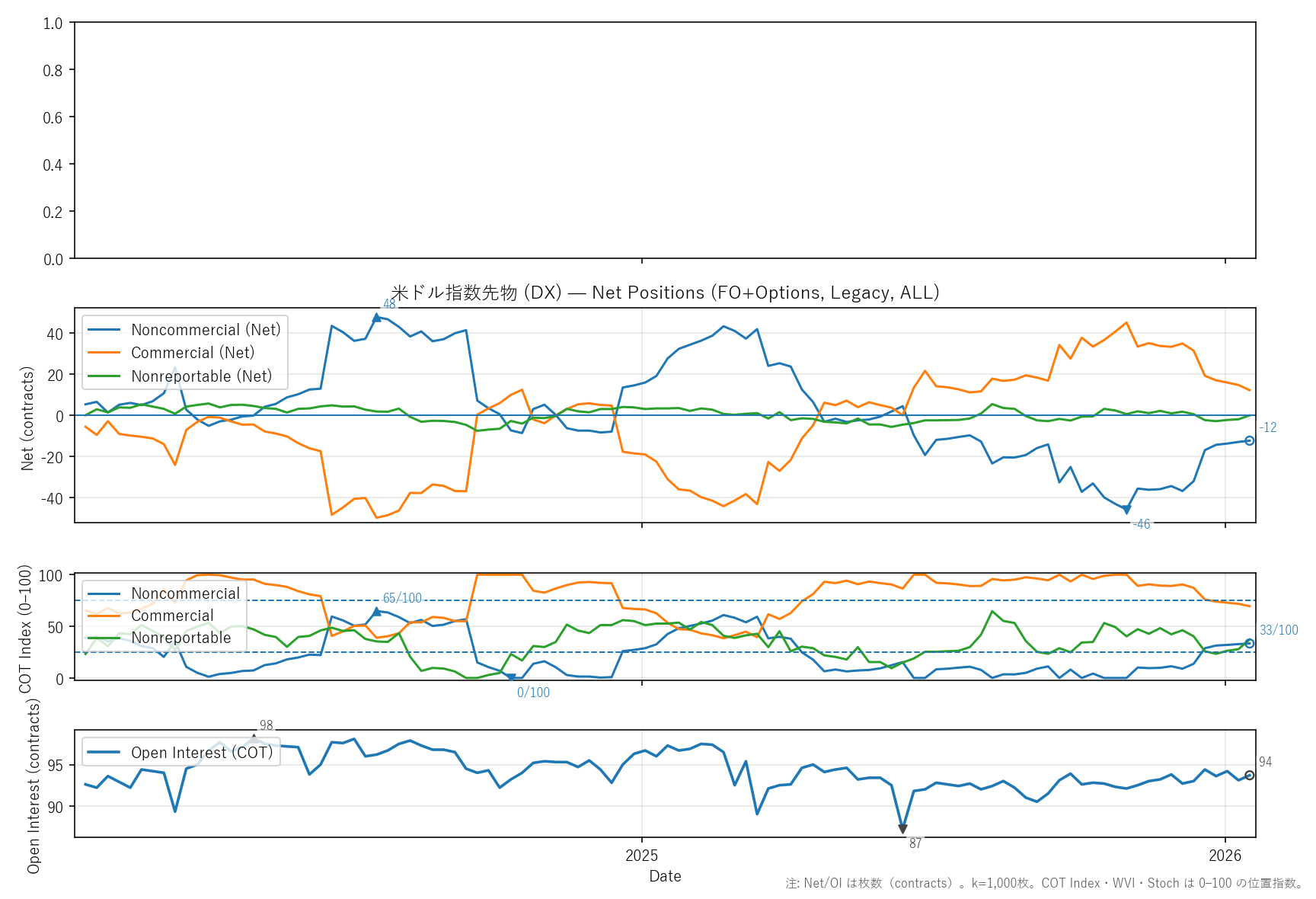 先週比(2026-01-16):非商業COT指数:+1pt(-13 → -12) / 商業COT指数:-3pt(15 → 12) / NR COT指数:+2pt(-2 → 0) / Open Interest:+0.64%(93 → 94)