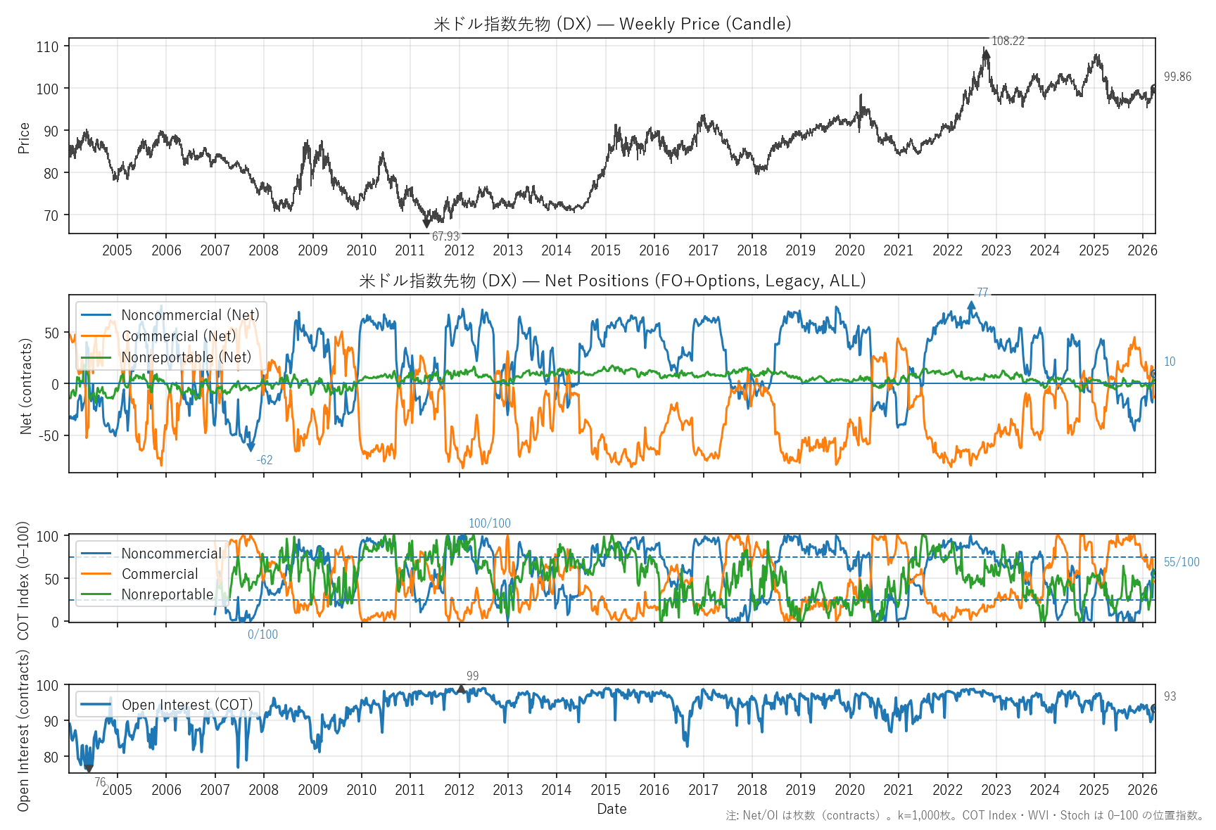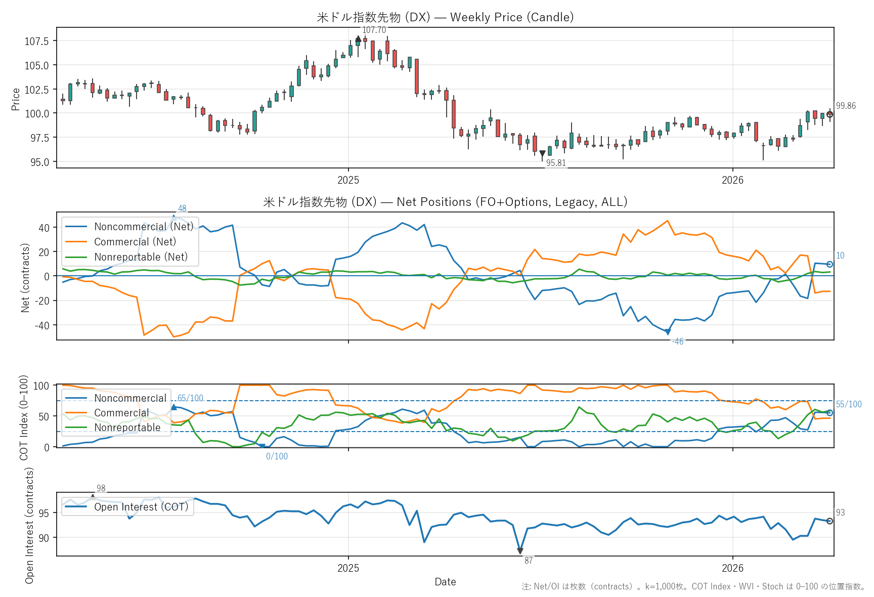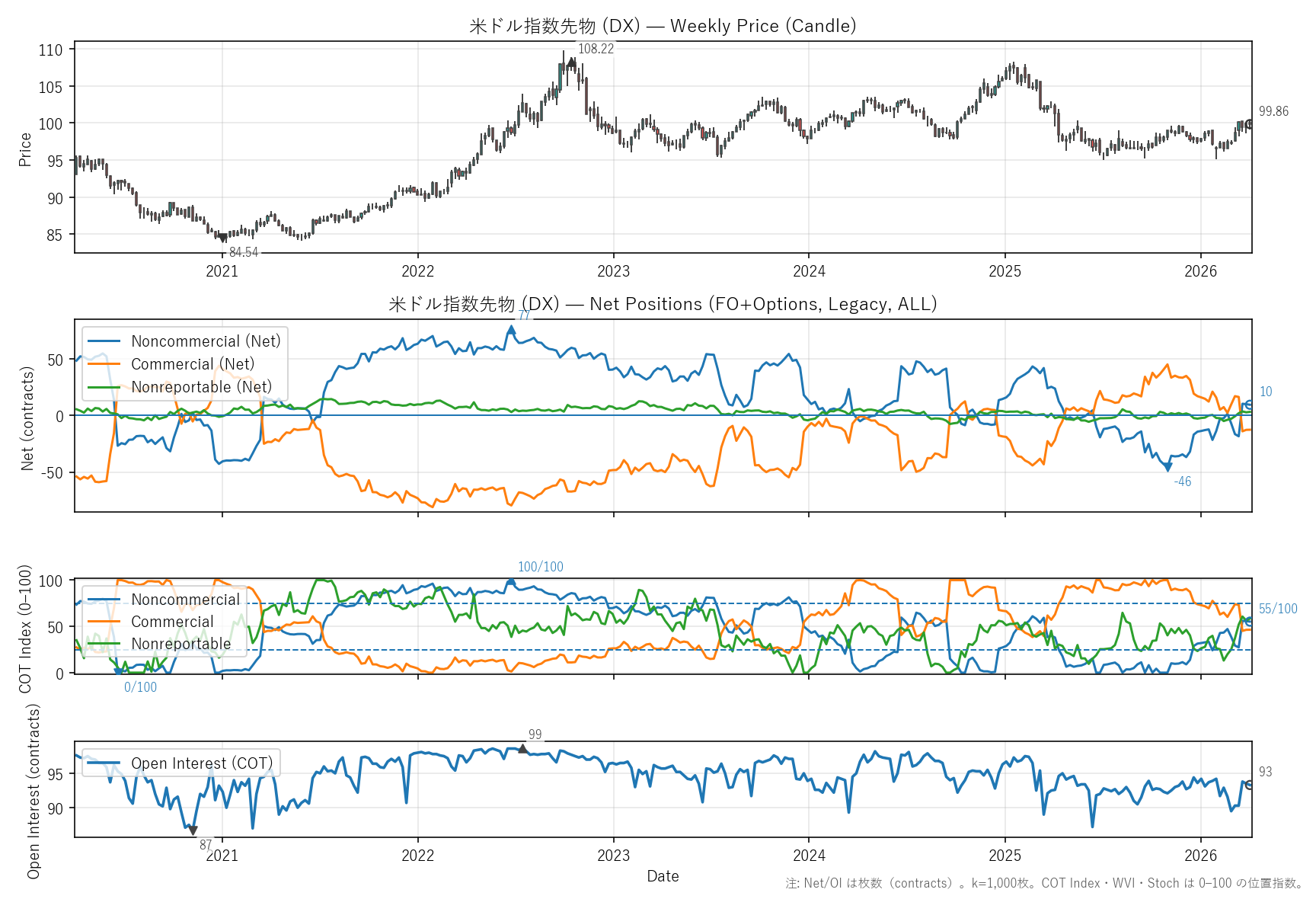先週比(2026-04-03):非商業COT指数:-0pt(10 → 10) / 商業COT指数:+0pt(-13 → -13) / NR COT指数:+0pt(3 → 3) / Open Interest:-0.21%(94 → 93)