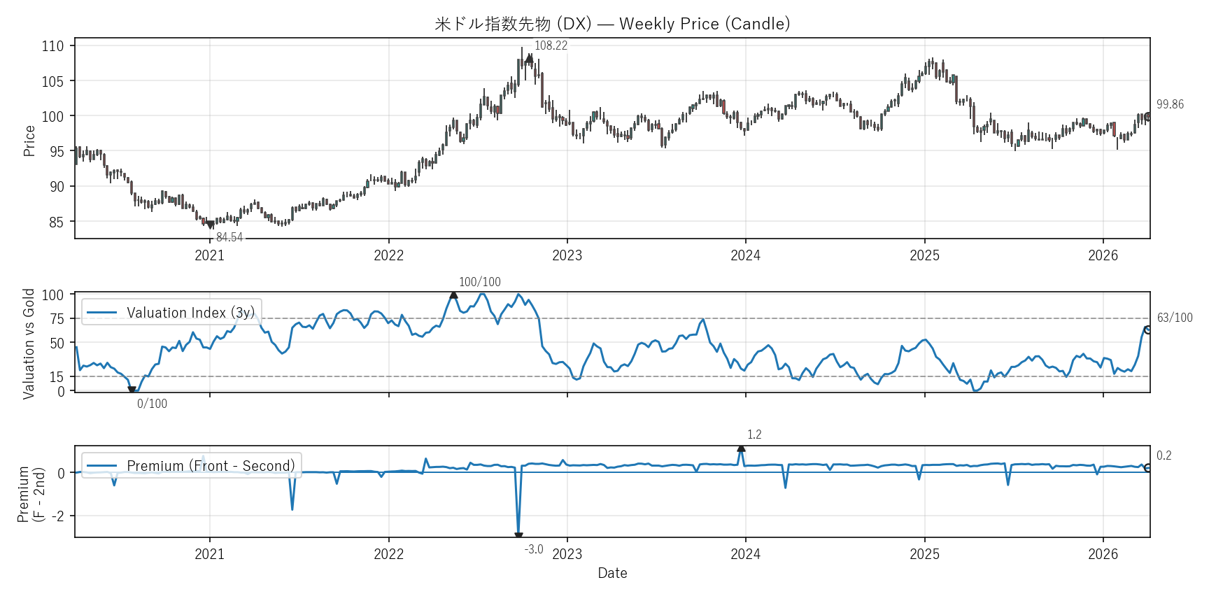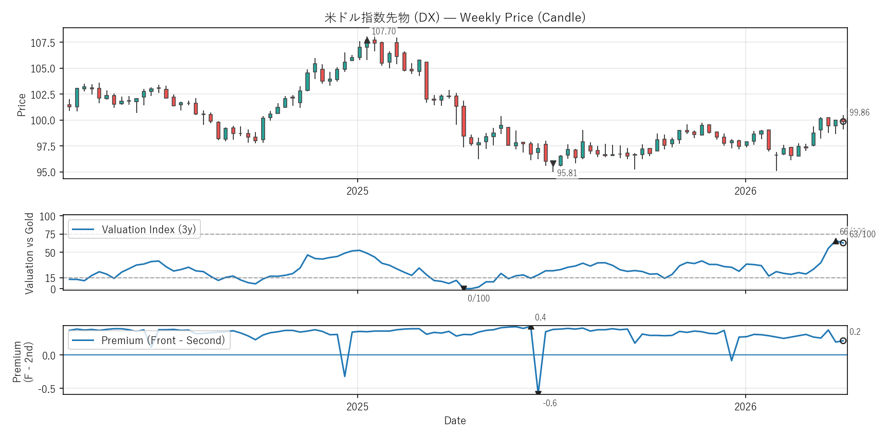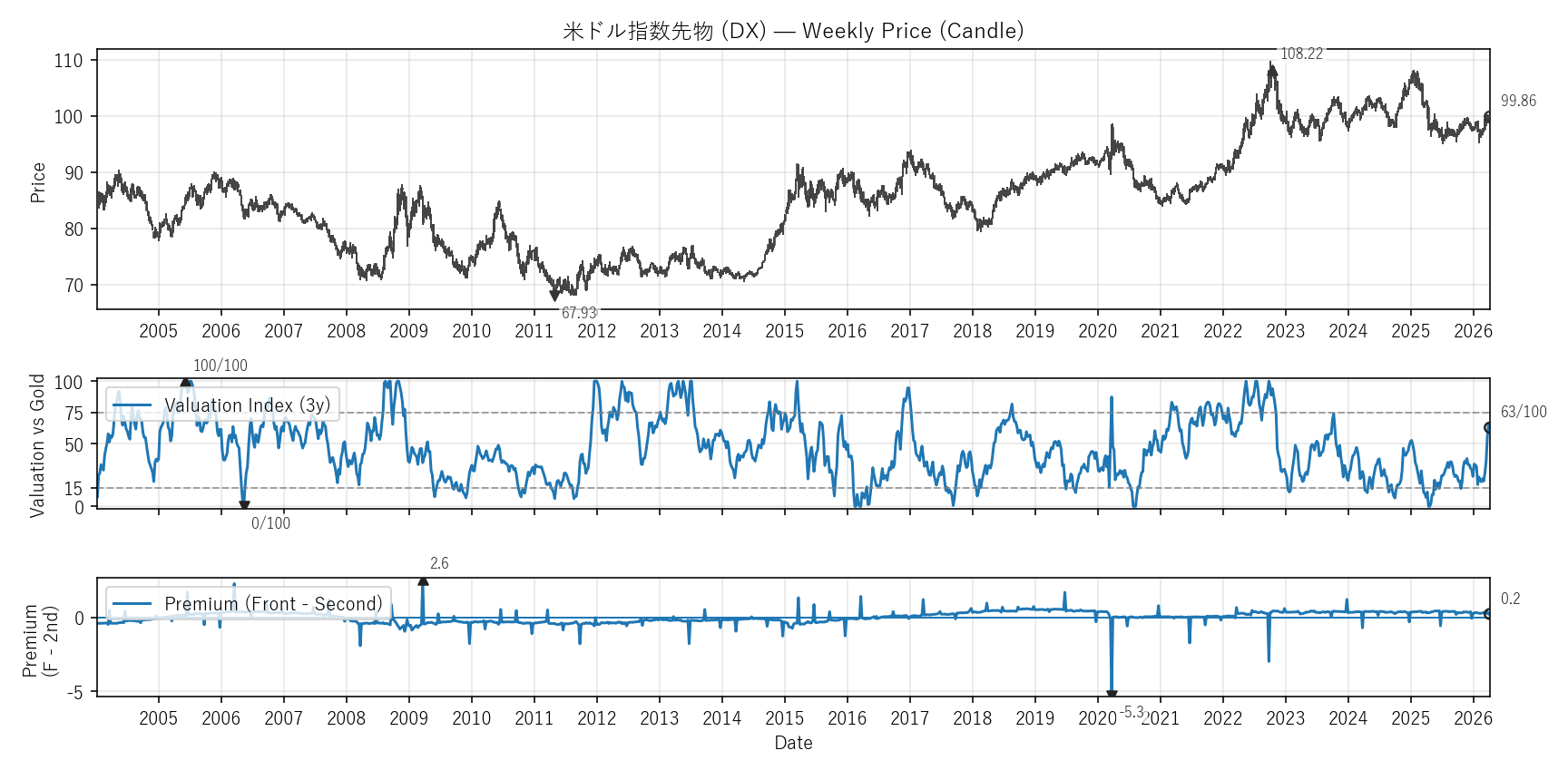 Valuation(WVI)は「基準資産と比べて相対的に高い/安いか」をみる指標。通常は金(GC)、金自身は米30年債(ZB)と比較。価格比(対象/参照×100)を短期/長期EMAで平滑化→差(PAL)の過去位置を0〜100で表示。PremiumはFront−Second(順鞘/逆鞘)。