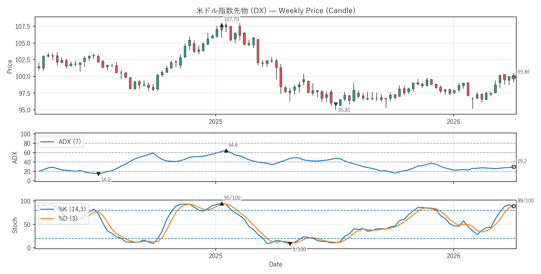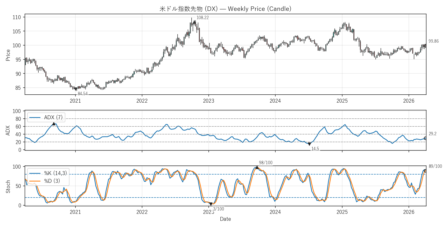 先週比(2026-04-03):週次リターン:-0.93%(終値 99.86 → 98.93) / ADX:-2.7pt(29 → 27)