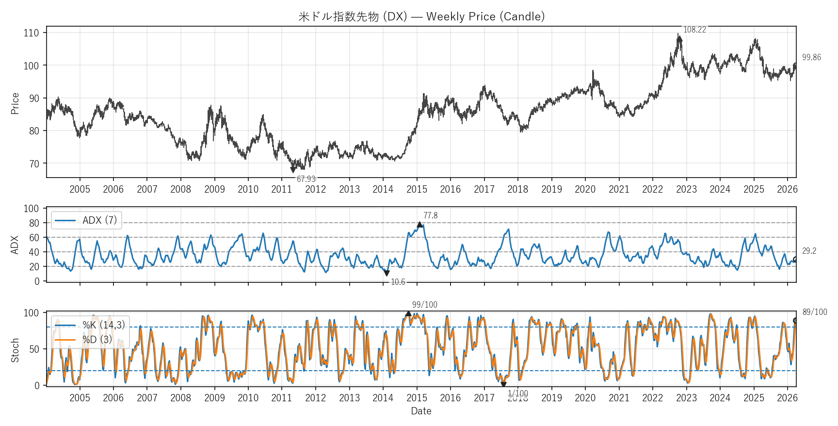 テクニカルは勢い(ADX)と位置(Stoch %K)。ADXは20超=発生、40超=強め。Stochは0〜100で80以上/20以下が目安。