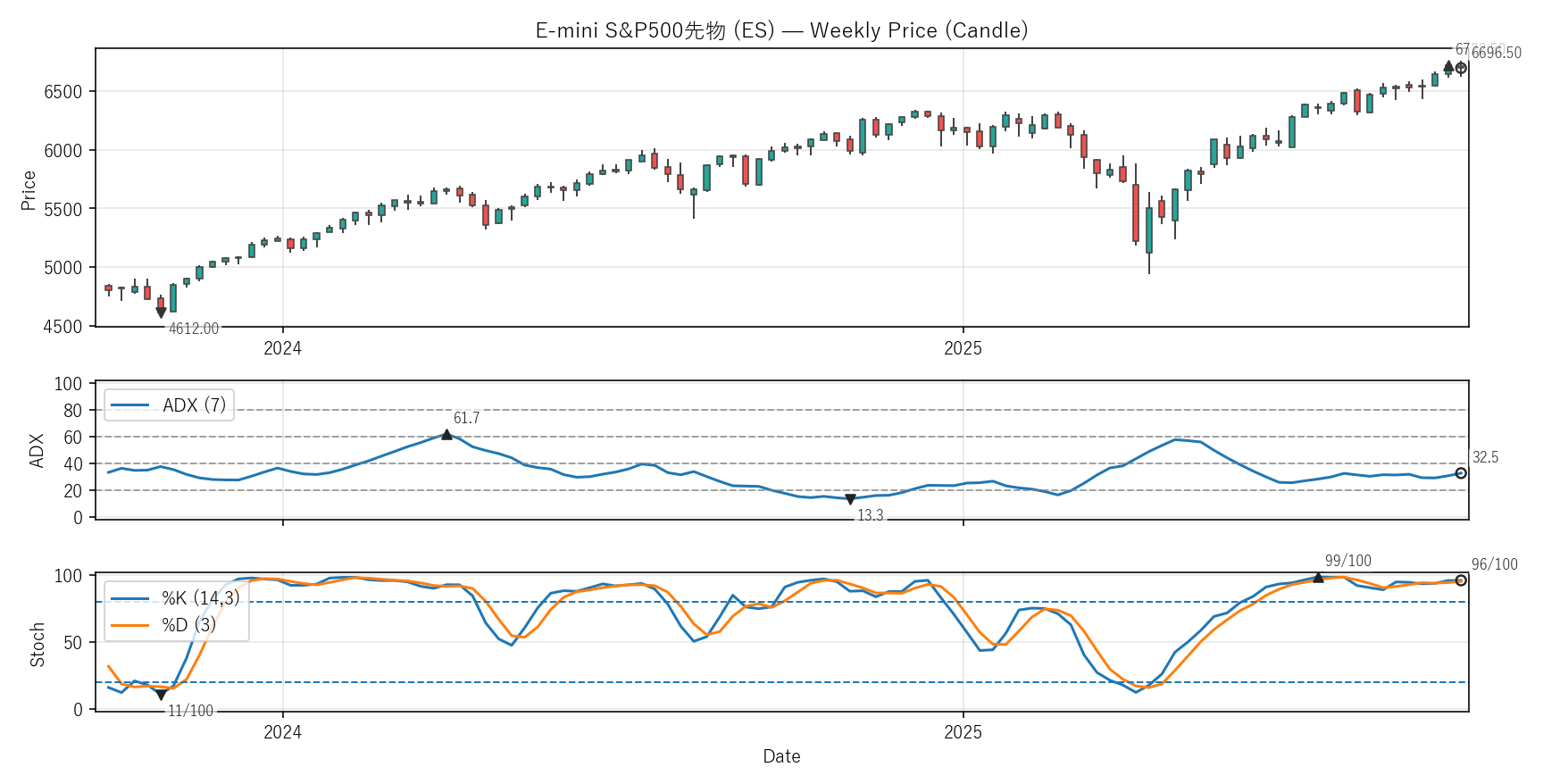 先週比(2025-09-26):週次リターン:-2.49%(終値 6764.00 → 6595.25) / ADX:-4.5pt(35 → 31)
