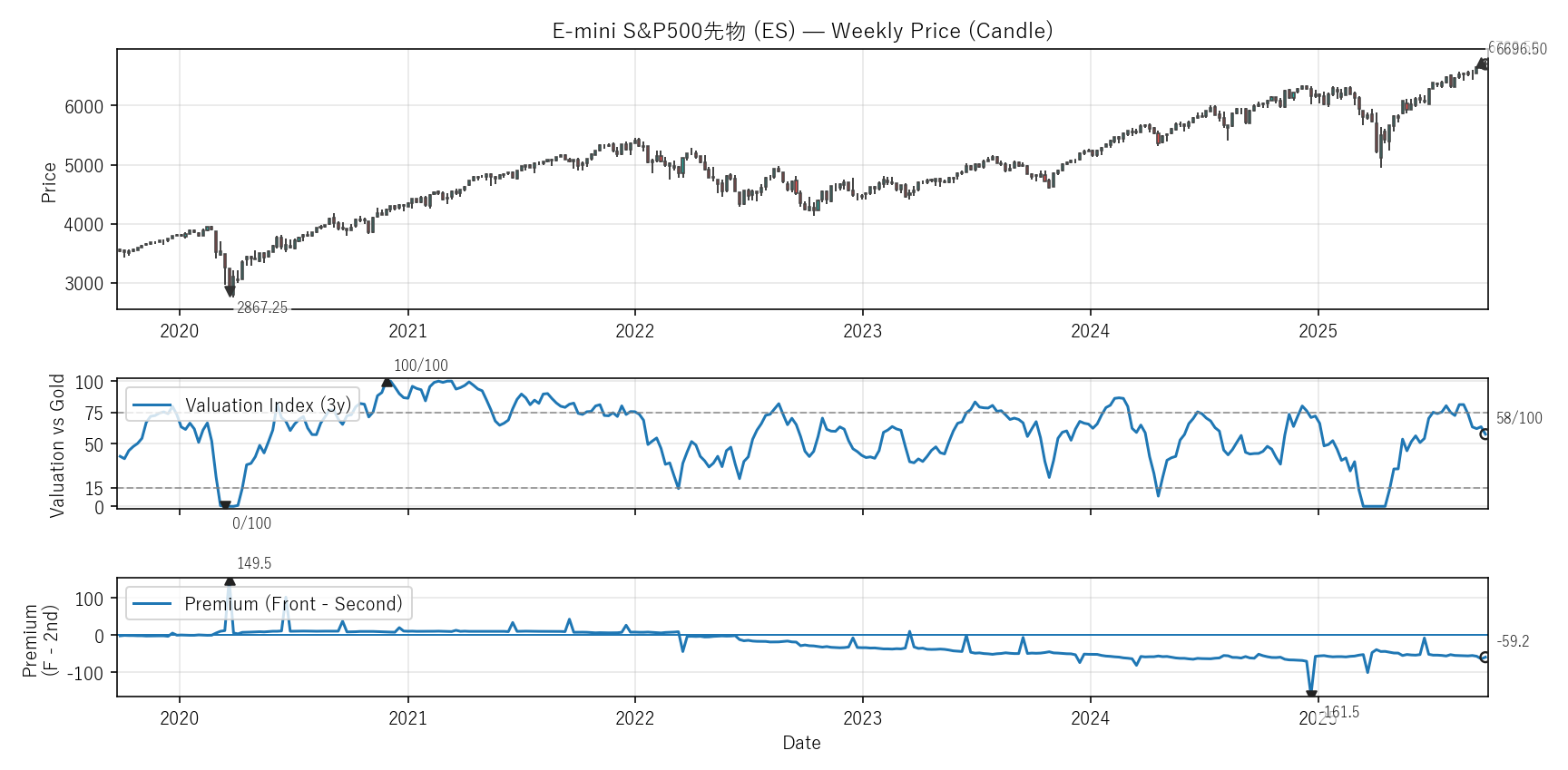 先週比(2025-09-26):Valuation:-10.4pt(53 → 43) / Premium:+4.5(-63.7 → -59.2)