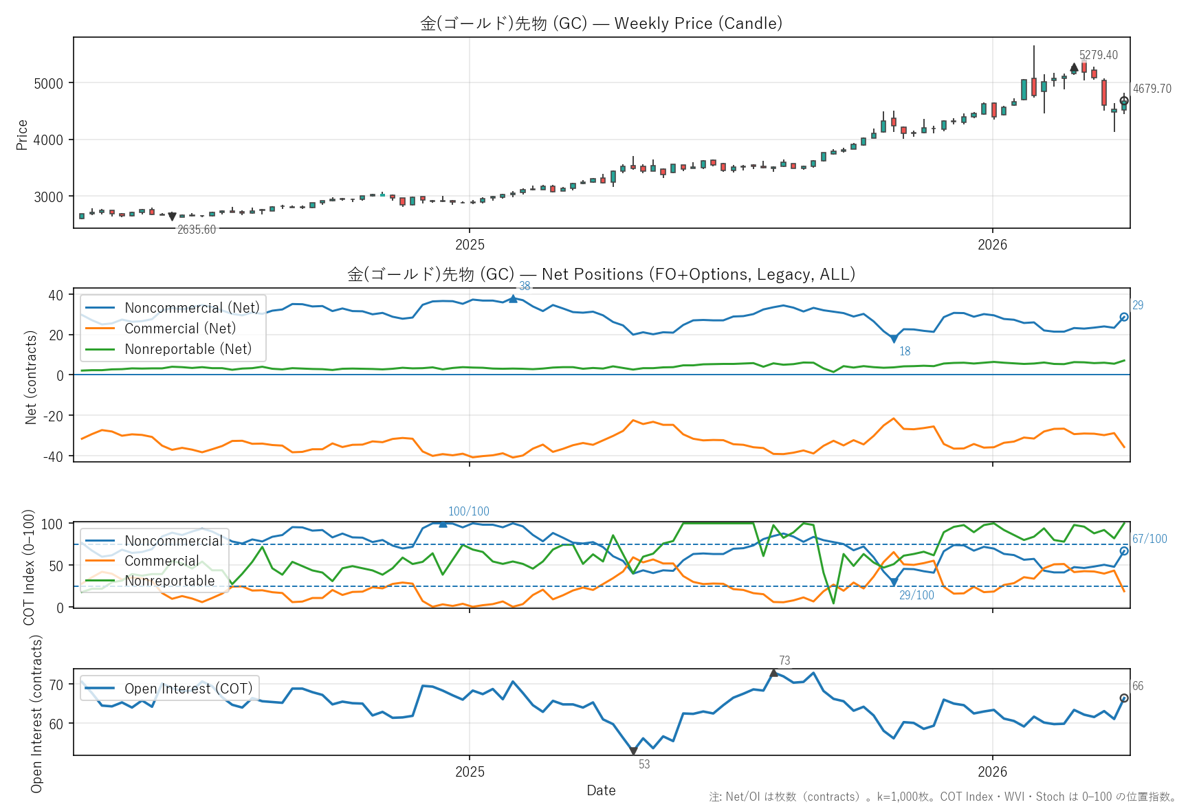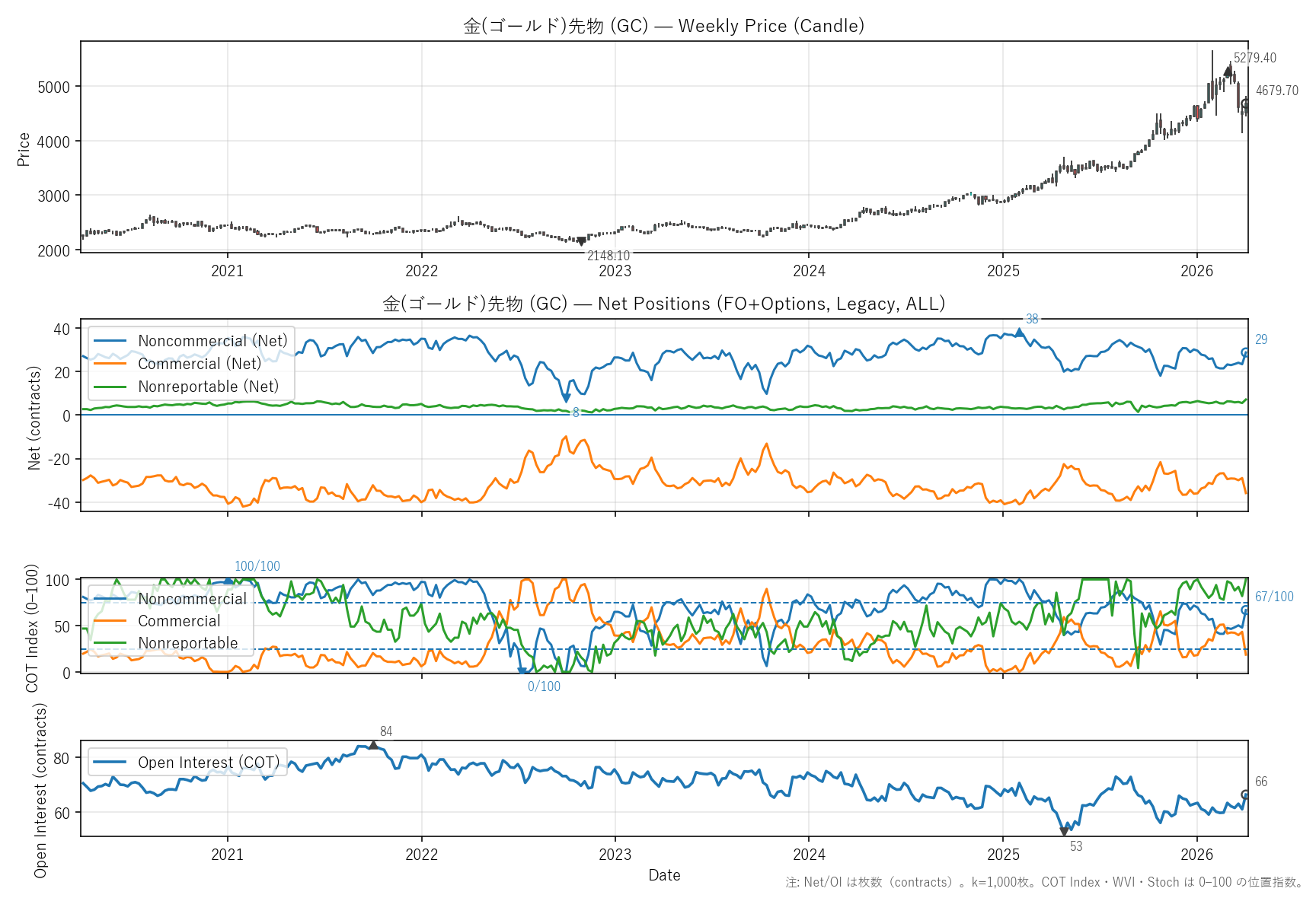 先週比(2026-04-03):非商業COT指数:+5pt(23 → 29) / 商業COT指数:-7pt(-29 → -36) / NR COT指数:+2pt(6 → 7) / Open Interest:+8.67%(61 → 66)