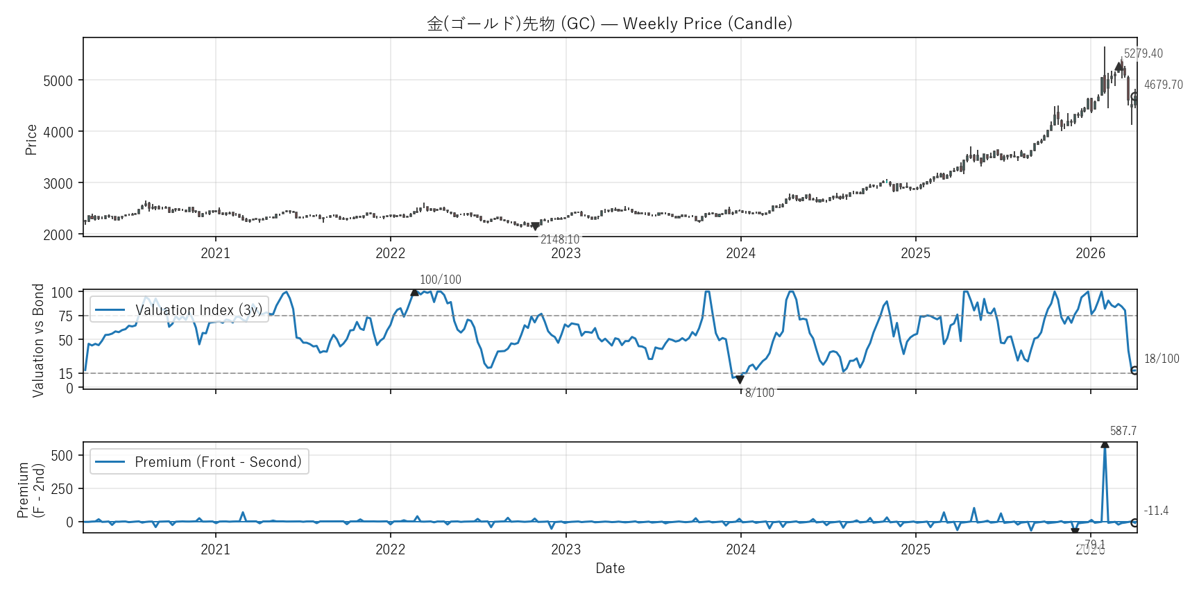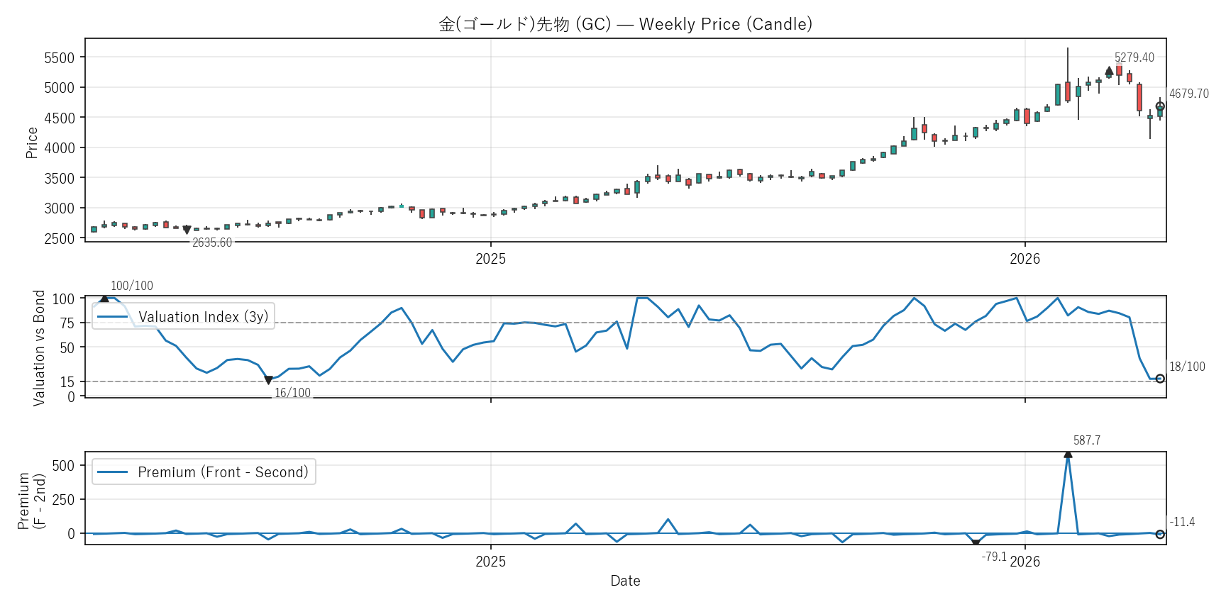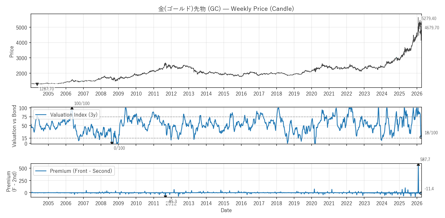 Valuation(WVI)は「基準資産と比べて相対的に高い/安いか」をみる指標。通常は金(GC)、金自身は米30年債(ZB)と比較。価格比(対象/参照×100)を短期/長期EMAで平滑化→差(PAL)の過去位置を0〜100で表示。PremiumはFront−Second(順鞘/逆鞘)。