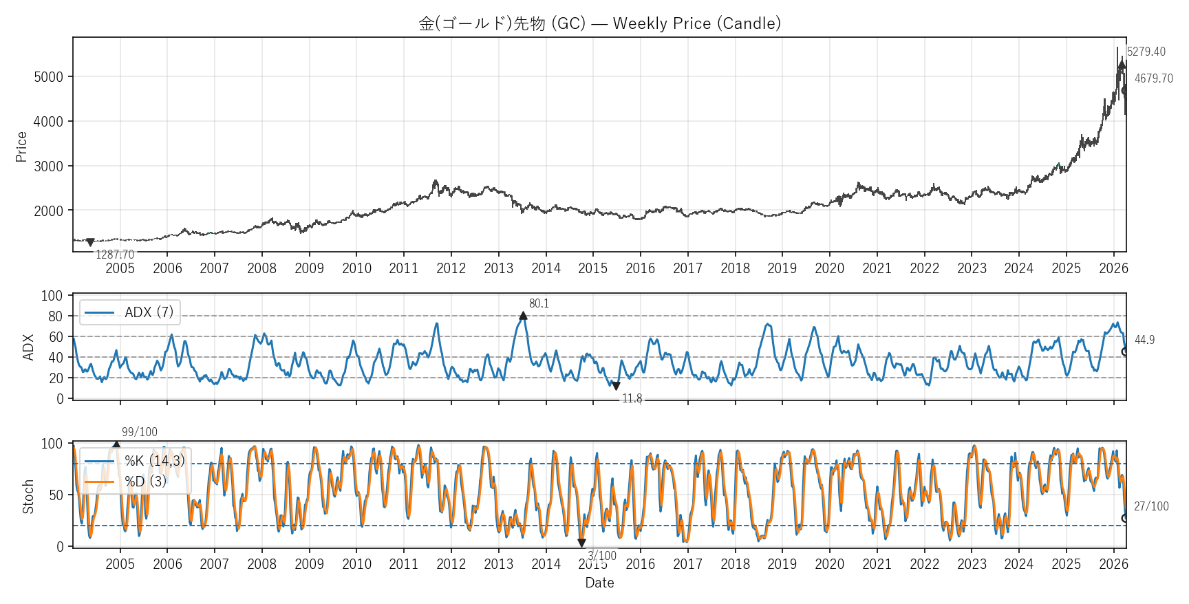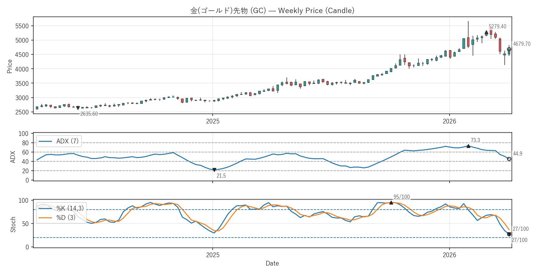 ADX:44.9(12.2〜73.3)|位置 54/100 / Stoch %K:27(6〜98)|位置 23/100