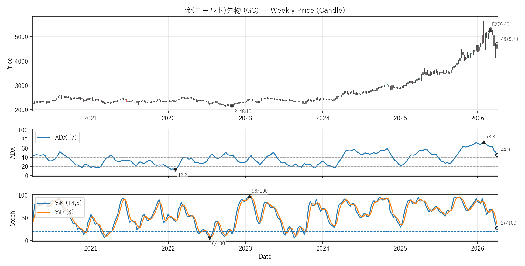 先週比(2026-04-03):週次リターン:+2.08%(終値 4679.70 → 4777.20) / ADX:-5.5pt(45 → 39)