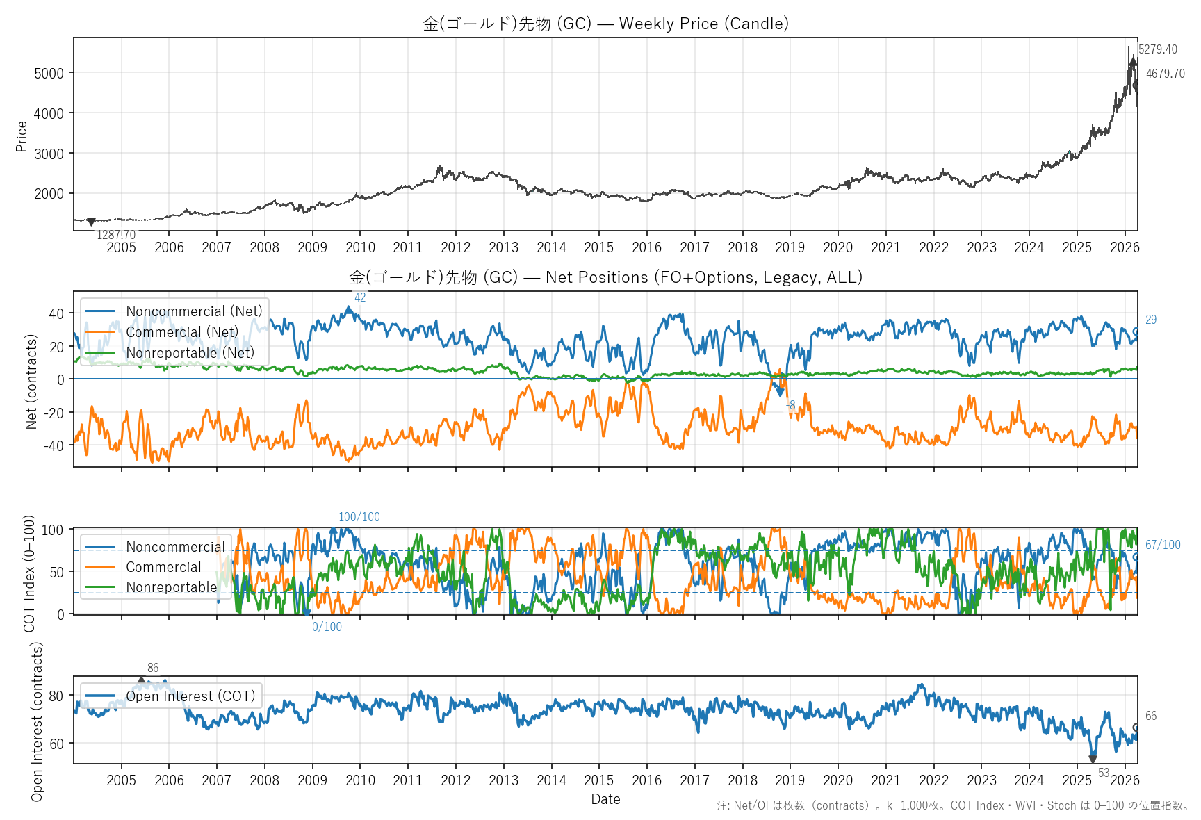 COTは、先物市場で「誰がどれくらい買い(ロング)・売り(ショート)を持っているか」をCFTCが毎週公表するデータです。①COT指数(0〜100)=約3年の範囲での位置、②Net=ロング−ショート、③OI=未決済建玉枚数(本サイトは3者のLONG合計で近似)。